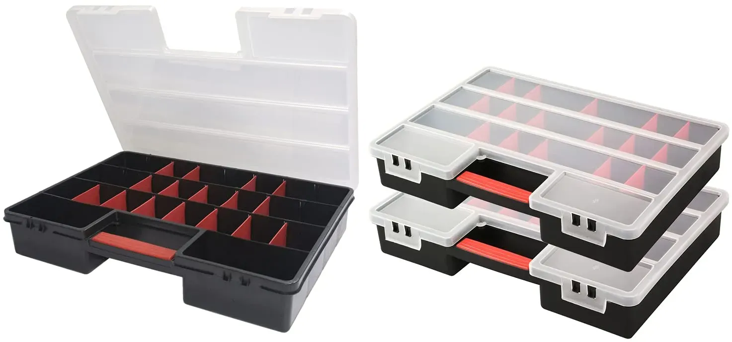 Kategorie: Aufbewahrungsboxen - Kreher - GTIN:4017787602941 - MAXIMALE FLEXIBILITäT - 3 Stück Kreher XXL Sortierboxen - 21 variable rote Trennwände pro Box ermöglichen bis zu 24 individuell anpassbare Fächer. Zusätzlich 2 fixe Fächer. Kreher XXL Sortimentskasten - Ideal für Schrauben, Nägel, Dübel, Elektronikteile, Angelzubehör, Lego, Bastelzubehör und mehr. ROBUSTE QUALITäT - Werkzeug-Kleinteile-Koffer 46 x 32 x 8 cm. Gefertigt aus recyceltem, umweltfreundlichem Kunststoff (PP). Perfekt für Werkstatt, Büro, Hobbyraum oder professionelle Handwerker. Hält selbst härtesten Belastungen stand. VOLLE üBERSICHT - Transparenter Deckel gewährt sofortigen Einblick in den Inhalt. Organisieren Sie mühelos Kleinteile, Werkzeug, Schmuckzubehör oder Kosmetikartikel. JETZT IN DEN WARENKORB LEGEN! SICHERER TRANSPORT - Komfortabler 13 x 3 x 2 cm großer Griff für müheloses Tragen. Robuste Klippverschlüsse halten alles sicher an Ort und Stelle, ideal für Baustelle oder Heimwerker. Organizer kann mit Kabelbinder verschlossen werden. VIELSEITIG EINSETZBAR - Ob für GoPro-Zubehör, Autoteile, Sicherungen oder Schmuckherstellung - dieser XXL Sortierkasten passt sich Ihren Bedürfnissen an. Max. 24 Fächer mit 5,5 x 7,5 x 8 cm und 2 Fächer mit 14 x 7 x 8 cm pro Werkzeugkasten. DURCHDACHTES DESIGN - Schwarzer Korpus mit roten Akzenten für professionellen Look. Perfekt für die Organisation von Mopedteilen, Malutensilien oder als mobiles Ersatzteillager. PLATZSPARENDE LöSUNG - Stapelbar und kompakt, ... Die B2B Partner Rollende Box ist eine praktische Werkzeugbox mit Rollen, die den Transport erleichtert. B2bpartner .de B2B Partner Rollende Box für Werkzeug- 46x28x63,5 cm