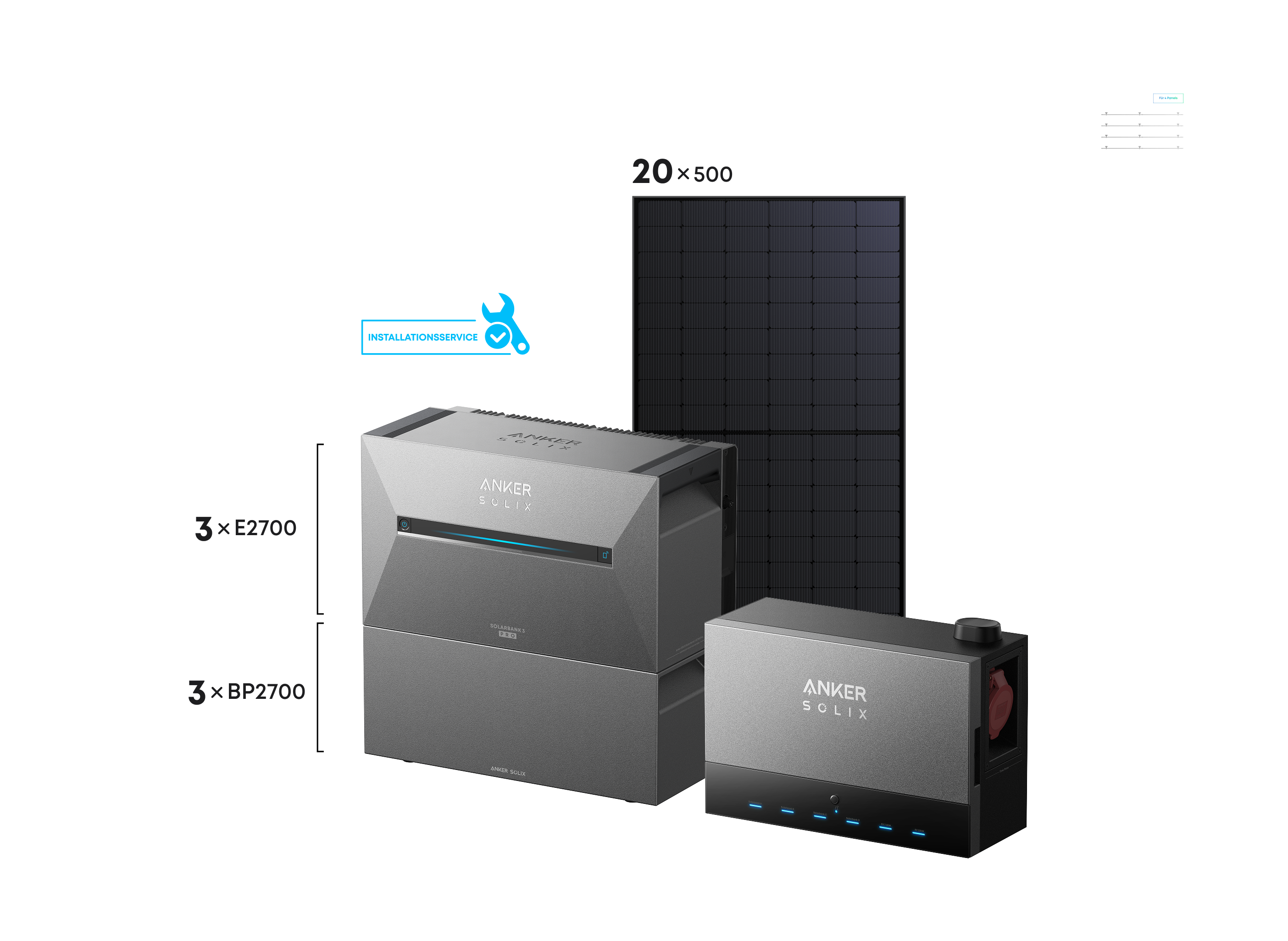 Kategorie: Stromspeicher - Anker - GTIN:4262442224857 - Das SOLIX 3 All-in-One Balkonkraftwerk von Anker (MPN: 024025) ist deine KI-optimiertes Balkonkraftwerk mit direkter Speicherlösung. Im Herzen des Sys... - 4221,37 Euro bei Offgridtec - gefunden von billiger.de Dieses Premium-Angebot mit drei Solarbanken, drei Erweiterungsakkus, Power Dock und 10000Wp Solarmodulen ist eine Komplettlösung für maximale Energieautarkie. ankersolix .com 3 Solarbank 3 E2700 Pro + 3 BP2700 Erweiterungsakku + Anker SOLIX Power Dock + 10000Wp Bifazial Solarmodul + Schrägdachhalterungen