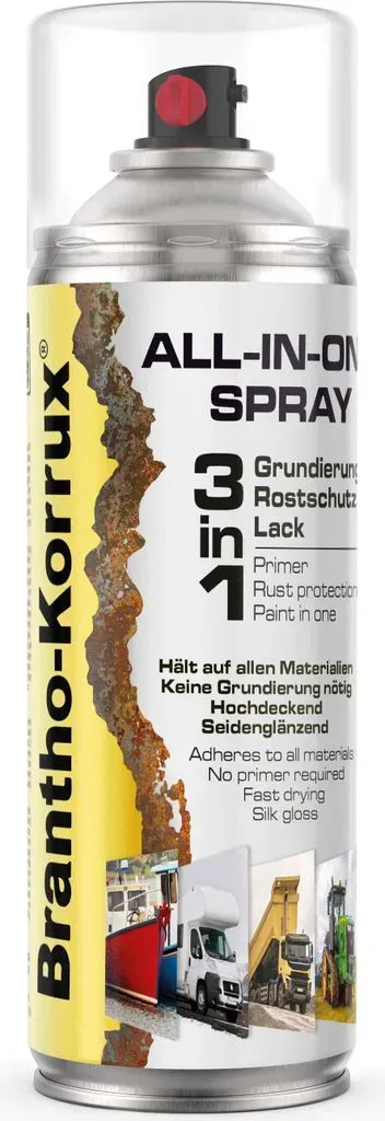 3 Händlerangebote bei billiger.de - Kategorie: öle & Schmierstoffe - Brantho Korrux - Brantho Korrux Komfortspray 3 in 1 Rostschutz, Grundierung & Lack in einer 400ml Spraydose Erleben Sie die innovative Lösung für Ihre Lackierprojekte mit dem KOMFORT SPRAY . Dieses All-in-One-Produkt kombiniert Primer, Rostschutz und Lack in einer praktischen Spraydose und spart Zeit und Aufwand. Produktvorteile 3 in 1 Funktionalität: Primer, Rostschutz und Lack in einem keine separate Grundierung nötig. Hervorragende Haftung: Geeignet für Metall, Holz, GFK, Glas, Beton, Edelstahl, Aluminium & mehr. Seidenglänzendes Finish: Hohe Deckkraft mit wetterfestem, UV-beständigem Schutz. Vielseitige Eigenschaften: Elastisch, füllkräftig, mit hoher Kantendeckung und Ergiebigkeit. Schnelltrocknend: Staubtrocken nach ca. 20-30 Min., durchgehärtet nach 8-10 Std. (bei 20 C, 65% rF). Anwendung Vorbereitung: Dose auf Raumtemperatur bringen & 2 Minuten kräftig schütteln. Probesprühen: An einer unauffälligen Stelle testen. Auftragen: Aus ca. 25 cm Entfernung im Kreuzgang sprühen, mit 2-3 Min. Zwischenablüftung. Nach Gebrauch: Dose umdrehen & Ventil leer sprühen zur Reinigung. Technische Daten Schichtdicke: Bis zu 120 m in einem Kreuzgang Oberfläche: Seidenglänzend Ergiebigkeit: Sehr hoch Witterungs- & UV-Beständigkeit: Ja Weitere Informationen Jetzt den KOMFORT SPRAY 3 in 1 bestellen die perfekte Lösung für Rostschutz, Metallschutz & Instandhaltung! - GTIN:7640165644911 Diese Sprühdose ist ideal für kleinere Anwendungen und bietet eine praktische All-in-One-Lösung. ![]() ![]() 3 in 1 Rostschutzlack - All-in-One Sprühdose - Brantho Korrux