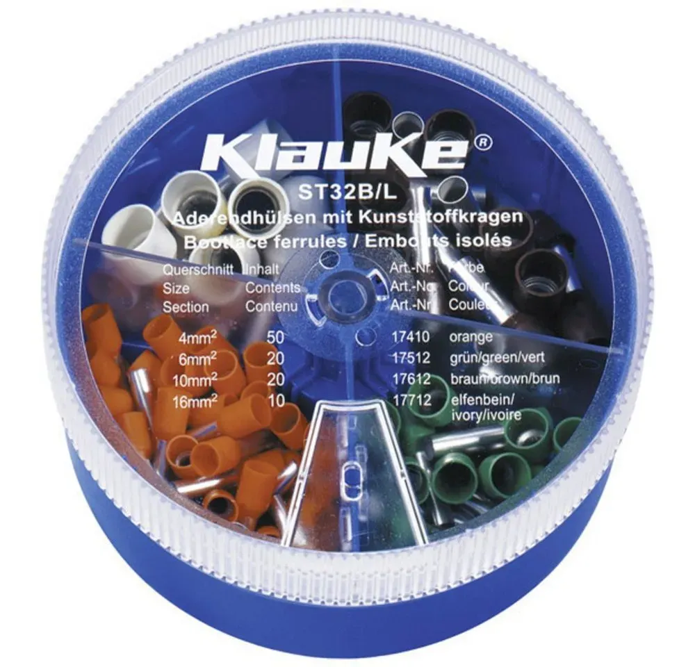 ![]() ![]() Klauke Aderendhülsen Klauke ST32B Aderendhülsen-Sortiment 4 mm2, 6 mm2, 10 mm2, 16 mm2 Teil, ST32B braun|grün