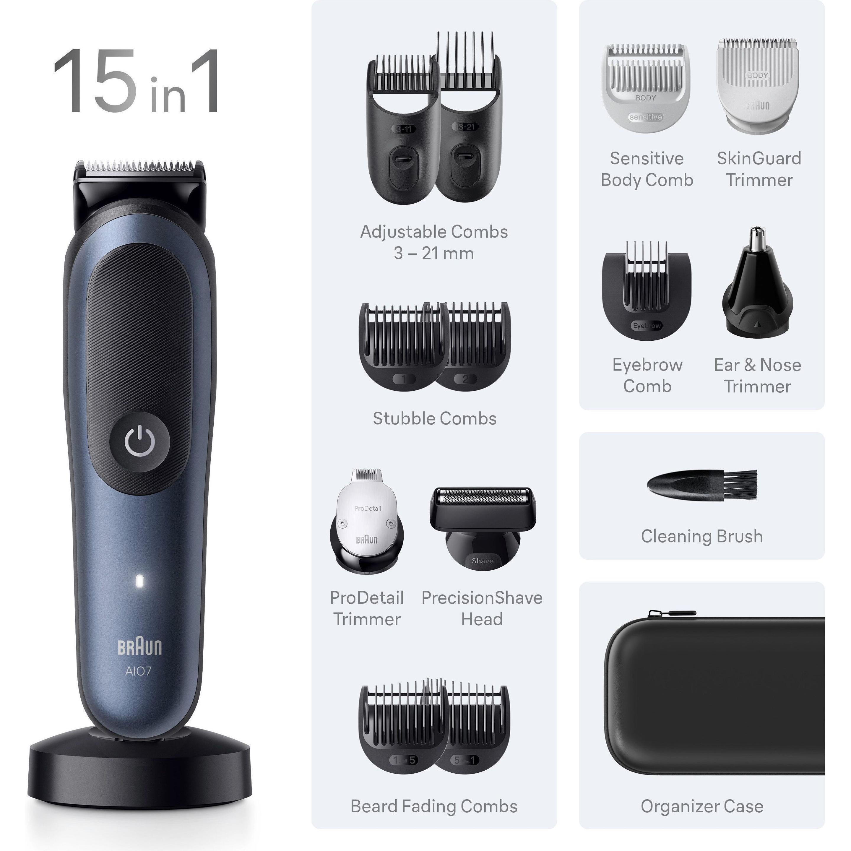 keine Angabe Gewöhnlich versandfertig in 11 bis 12 TagenBraun All-in-One Fellpflegeset Serie 7, 15 in 1, ProBlade & AutoSense, 120 min, SkinGuard & Beard Fading, AquaGrip für Unterwasseranwendung, AIO7580, Designed in Germany - Blau