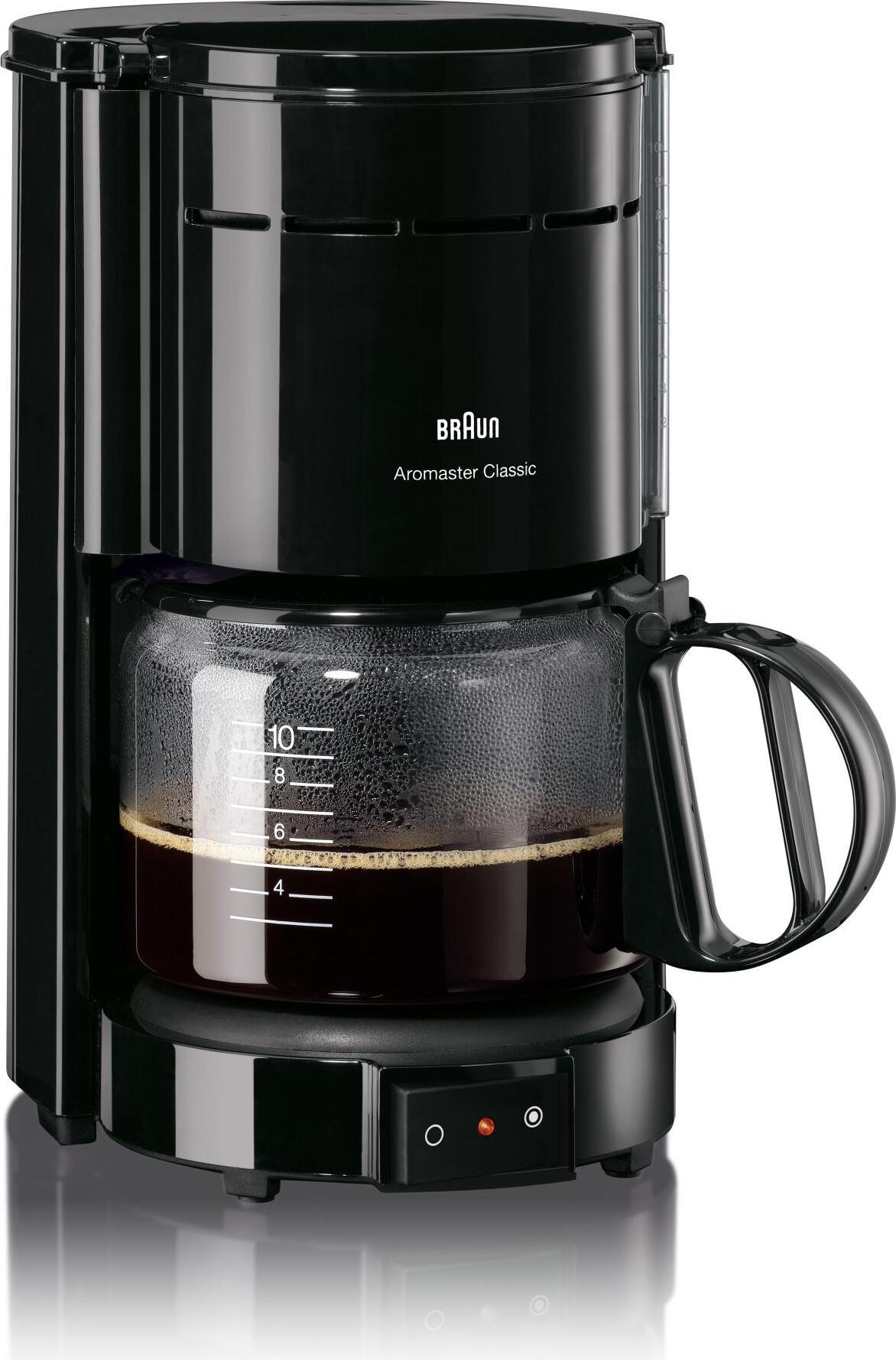 30 Händlerangebote bei billiger.de - Kategorie: Kaffeemaschinen - Braun - Kaffeemaschine für 10 Tassen mit dem einzigartigen Braun Aromaschutz-System Aroma-Glaskanne und energiereduzierte Warmhalteplatte Aroma-Brühtechnik und Schwenkfilter mit Aromaschutz automatischer Filterverschluss (Tropfstopp) beim Herausnehmender Kanne überlaufschutz - GTIN:4210201130406 Für 39.99 Euro bietet Joybuy eine schwarze Braun Filterkaffeemaschine KF 47/1 Aromaster Classic mit praktischen Funktionen wie Abschaltautomatik und Tropfstopp. ![]() ![]() Braun Filterkaffeemaschine KF 47/1 Aromaster Classic, 10 Tassen, Glaskanne, Abschaltautomatik, Tropfstopp, schwarz