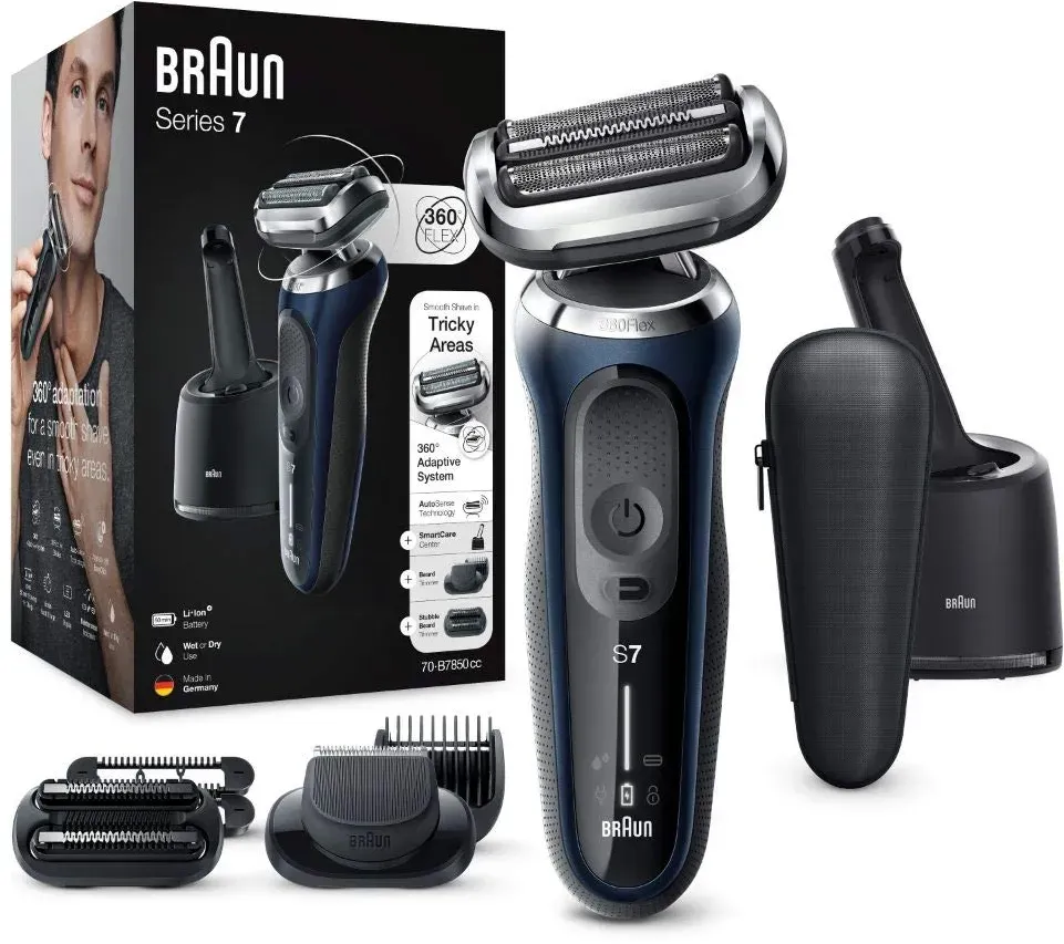 Kategorie: Elektrische Rasierer - Braun - GTIN:4210201290933 - 360 Flex: Elektrorasierer mit 360 -Anpassung für eine gründliche Rasur sogar an schwer erreichbaren Stellen. Hergestellt in Deutschland EasyClick: Umrüstbar zum Barttrimmer mit 5 Bartkämmen und 3-Tage-Bart-Trimmer dank EasyClick. Aufsätze im Pack enthalten. Das EasyClick System ermöglicht eine einfache Umrüstung Ihres Rasierers für noch mehr Funktionen AutoSense: Die Motorleistung wird der Bartdichte angepasst, da die AutoSense-Technologie Ihren Bartwuchs erkennt Li-Ionen-Akku: 50 Minuten Akkulaufzeit dank Lithium-Ionen-Akku. Eine Schnellladung von 5 Minuten reicht für eine Rasur Wet und Dry: 100% wasserdichter elektrischer Rasierer für Wet und Dry Anwendung Zusätze: Inklusive 4-in-1 Reinigungsstation für einen Rasierer wie am ersten Tag - 194,99 Euro bei Amazon Marketplace Automotive - gefunden von billiger.de Dieses Modell der Braun Series 7 ist eine ausgezeichnete Wahl für anspruchsvolle Nutzer, die Wert auf eine gründliche Rasur und eine Reinigungsstation legen. ![]() ![]() Braun Series 7 Rasierer Herren mit 360° Anpassung, Elektrorasierer & Barttrimmer, 3-Tage-Bart-Trimmer, Reinigungsstation, AutoSense, Wet & Dry, EasyClick Funktion, 70-B7850cc, blau