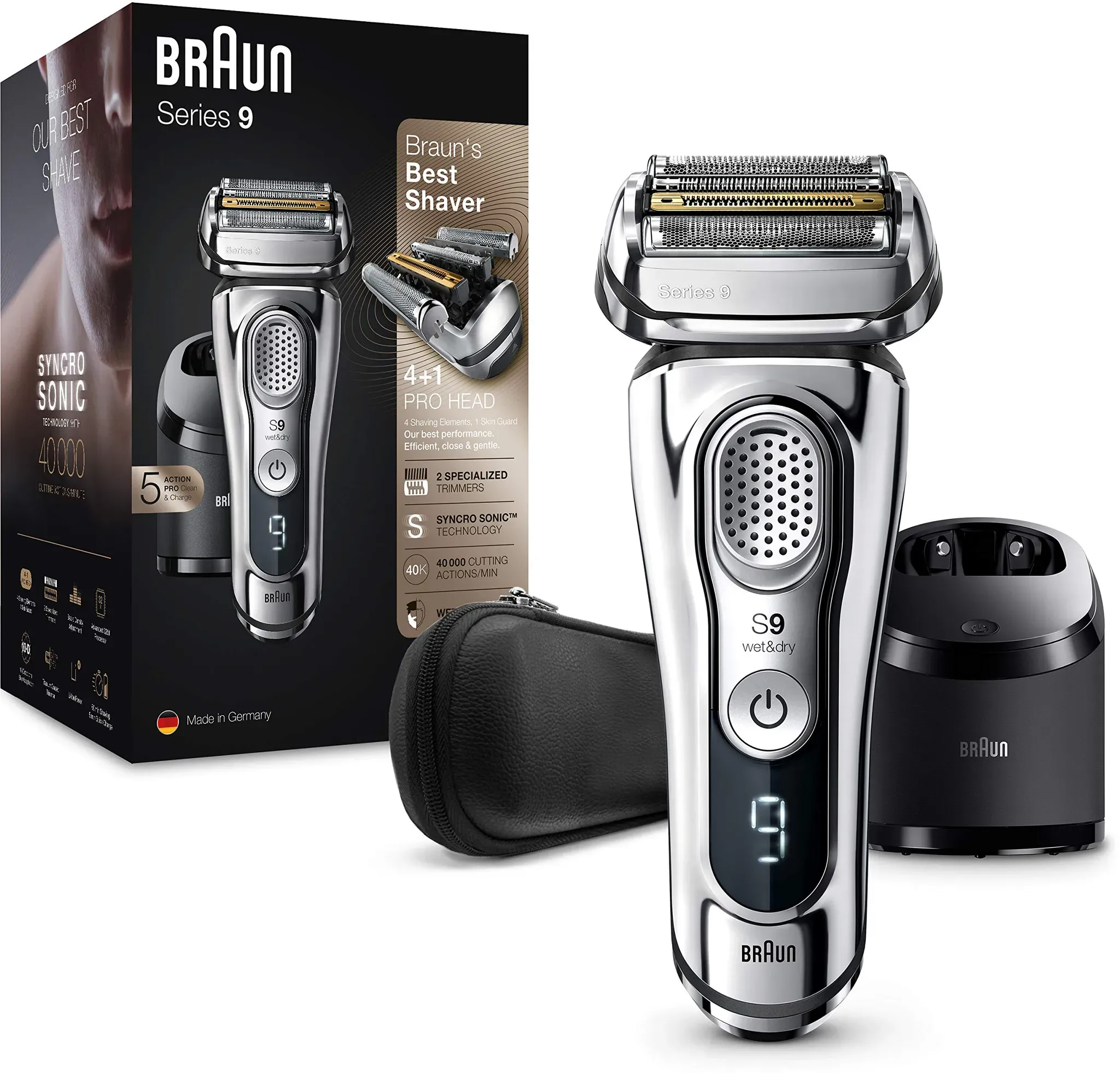 Gesamtsortiment Beauty + Gesundheit Haushalt Beauty + Gesundheit Rasur + Haarentfernung Rasierapparat Elektrische Rasierer, Trimmer & Epilatoren - EAN:7500435218030 - Der Braun Series 9 Pro+ Elektrorasierer definiert die Rasur neu - für eine gründliche Rasur mit ultimativem Hautkomfort. Mit fünf speziellen ProShave-Elementen, einschliesslich ProLift-Klinge, sorgt der Series 9 Pro+ für eine effiziente und sanfte Rasur in jedem Zug, egal ob Sie einen 1-, 3- oder 7-Tage-Bart haben. Erleben Sie die ultimative Präzision dank ProTrimmer mit Klingen aus Chirurgenstahl, der selbst längere Haare, Koteletten und Schnurrbart effektiv erfasst. Komplett in Deutschland hergestellt, bietet er eine lange Lebensdauer, selbst bei täglicher Rasur, sowie einen leistungsstarken Li-Ionen-Akku mit 60 Minuten Laufzeit. Er ist für die Trocken- und Nassrasur geeignet und wird mit einer Ladestation geliefert. Im Lieferumfang enthalten: 1x Elektrorasierer, 1x Ladestation, 1x Reise-Etui, 1x Ladekabel, 1x Reinigungsbürste. Alle Rasierer der Serie 9 Pro+ sind nur mit der Reinigungsstation 5in1 kompatibel. - gefunden von Kelkoo Dieser Series 9 Rasierer bietet eine verbesserte Reinigungs- und Ladestation sowie eine Ledertasche für Premium-Pflege. ![]() ![]() Braun Series 9 9395cc Elektrorasierer für Herren, verbesserte Reinigungs- und Ladestation, Ledertasche, Elektrorasierer für Nass- und Trockenheit, Präzisionstrimmer, verchromt | 1er Pack