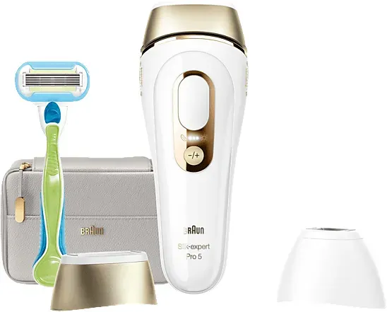 Auf Lager Versand durch AmazonBraun IPL Silk Expert Pro 5 ? IPL Geräte Haarentfernung, Dauerhafte und Schmerzfreie Haarentfernung für Zuhause ? inkl. Etui, Venus Rasierer, 2 Aufsätze, Designed In Germany ? PL5157, Weiß/Gold