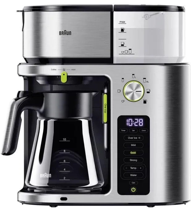 Kategorie: Kaffeemaschinen - Braun - GTIN:8021098320049 - GENUSSVOLLES KAFFEE-ERLEBNIS: Ob zum Frühstück oder als kleine Kaffeepause am Tag, die Filterkaffeemaschine bietet Kaffeegenuss für 1 bis 10 Tassen in der Kanne bleiben Temperatur und Aroma des Kaffees über längere Zeit erhalten PERFEKT GEBRüHT: Das OptiBrew-System der Kaffeemaschine sorgt für optimale Hitze, Brühzeit und Extraktion des Kaffeepulvers, während der Brita-Filter geschmacksstörende Stoffe reduziert und einen ausgewogenen Geschmack ermöglicht JEDERZEIT GENIE EN: Durch das Anti-Tropf-System können Sie die Kaffeekanne selbst während des Brühvorgangs herausnehmen, da die Maschine den Durchlauf des Filterkaffees automatisch und ohne Nachtropfen stoppt HOHER BEDIENKOMFORT: Die Filtermaschine begeistert mit modernem Design und sorgt dank schwenkbarem Filterkorb mit überlaufschutz, dem Anti-Rutsch-Griff und der Abschaltautomatik nach 40 Minuten für eine mühelose Kaffeezubereitung LIEFERUMFANG: 1 x Caf House PurAroma DeLuxe KF 570/1, Kaffeemaschine mit Aroma-Kanne & Wasserfilter von Braun - 99,99 Euro bei Amazon Marketplace Kitchen - gefunden von billiger.de Die Braun MultiServe KF 9170 SI ist eine vielseitige Kaffeemaschine mit Direktwahl von 7 Portionsgrößen und Tee-Funktion. ![]() ![]() Braun MultiServe KF 9170 SI Kaffeemaschine - Filterkaffeemaschine mit Glaskanne, Direktwahl von 7 Portionsgrößen für bis zu 10 Tassen, Tee-Funtion, Touch Display, Zeitschaltuhr, 1750 Watt, Edelstahl