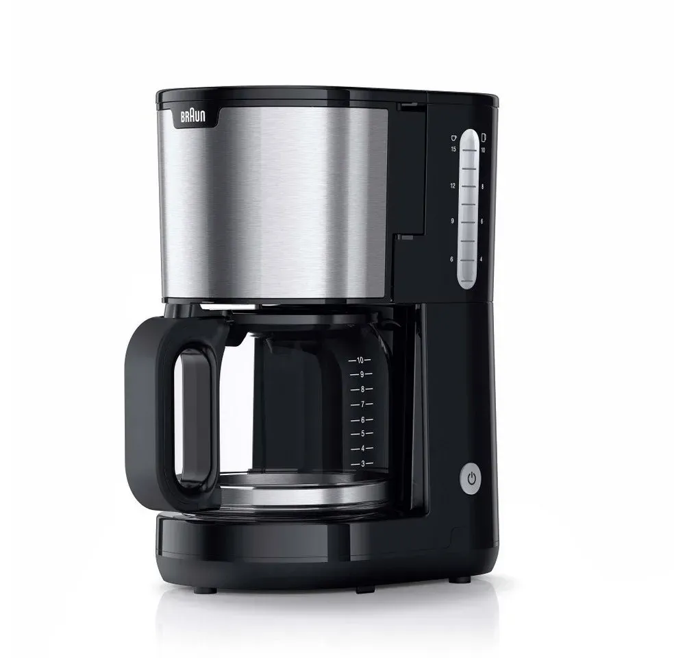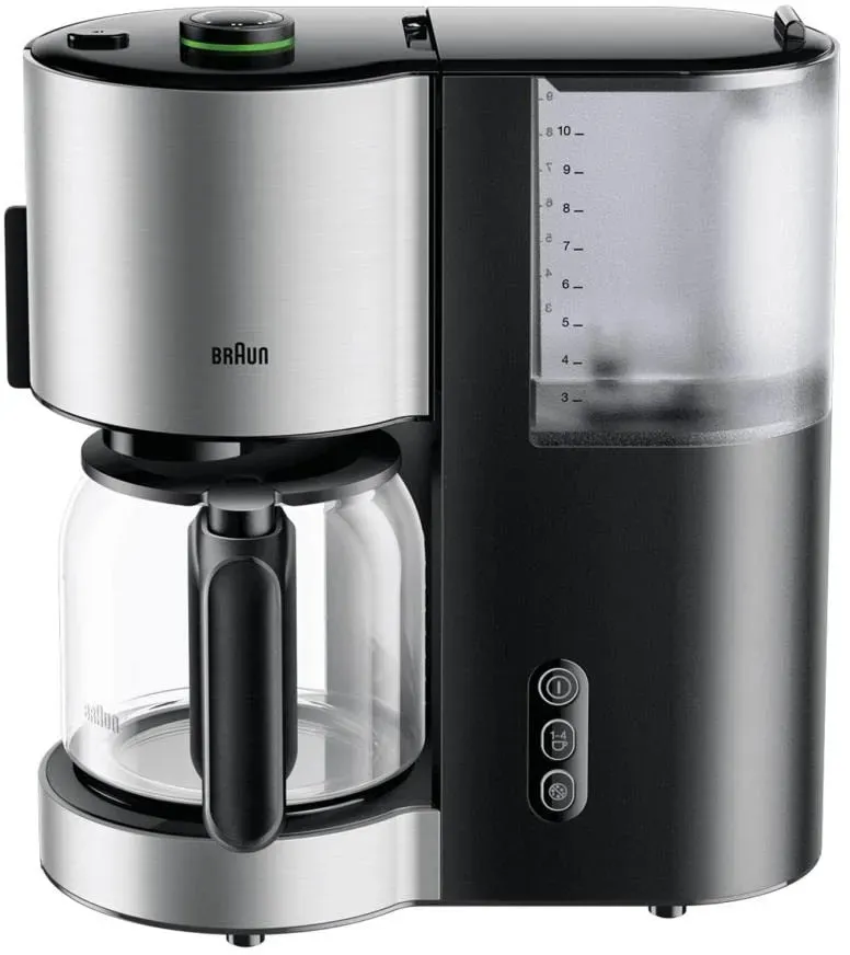 Gesamtsortiment Haushalt Kaffeemaschinen Filterkaffeemaschine Sonstige - EAN:8021098001887 - Braun KF1500WH PureShine Filterkaffeemaschine für 10 Tassen mit Glaskanne, schwenkbarem Filter, Tropf-Stopp und Abschaltautomatik. Die Wasserstandsanzeige und das OptiBrewSystem sorgen für gleichbleibend gutes Aroma dank des optimierten Zusammenspiels von Temperatur, Brühzeit und Extraktion. Das Anti-Tropf-System ermöglicht ein tropffreies Einschenken der ersten Tasse noch vor Ende des Brühvorgangs. Die Aromakanne aus stossfestem und thermoresistentem Glas hat einen speziellen Deckel, der den Kontakt mit der Luft minimiert, um die Temperatur und das Aroma des Kaffees länger zu erhalten. Der schwenkbare Filterkorb lässt sich bequem von vorne befüllen oder herausnehmen. Der Wasserstandsmesser mit doppelter Skala sorgt für maximale Sichtbarkeit und präzises Einfüllen, sodass Sie genau die Menge brühen können, die Sie benötigen. Produkthighlights: - Für 10 bis 15 Tassen Kaffee - Aromakanne aus Glas - Schwenkbarer Filterkorb - Anti-Tropf-System - Wasserstandsmesser mit doppelter Skala - OptiBrewSystem (optimale Temperatur, Brühzeit und Extraktion) - Abschaltautomatik nach 40 Minuten - BPA-frei, spülmaschinenfeste Teile, beleuchtete Taste Leistung: 1000 Watt Abmessungen: ca. 29,2 x 15,8 x 31,1 cm Spezifikationen: - Wattleistung: 1000 W - Farbe: Edelstahl/weiss - Kabelaufbewahrung: Ja - Spülmaschinengeeignete Teile: Ja - BPA-frei: Ja - Bedienfeld: Tasten - EasyClean-Design: Ja - ... Diese Braun Kf47/1 ist eine preisgünstige und bewährte Filterkaffeemaschine, ideal für den Einstieg. ![]()