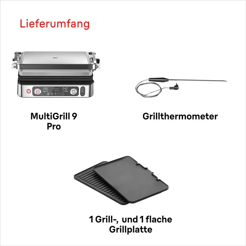Braun multigrill 9 pro META PreisvergleichMit dem Meta-Preisvergleich suchen Sie gleichzeitig bei den großen Preisvergleich Portalen!Jetzt live Suche nach braun multigrill 9 pro starten! Braun multigrill 9 pro KaufberatungWas ist der Braun MultiGrill 9 Pro?Der Braun MultiGrill 9 Pro ist ein vielseitiger Kontaktgrill, der sich durch eine große Grillfläche, individuelle Temperatursteuerung der oberen und unteren Platte, ein integriertes Bratenthermometer und verschiedene Betriebsmodi (Kontaktgrill, offener Grill, Ofen) auszeichnet[1][3][5]. Er eignet sich für Steaks, Burger, Gemüse, Fisch, Panini, Pfannkuchen und sogar Waffeln (mit optionalem Zubehör)[1][7]. Das Gerät ist besonders für Haushalte mit mehreren Personen oder kleine Feiern geeignet, da es bis zu 16 Burger-Patties gleichzeitig grillen kann[5]. Wichtige Produktmerkmale - Was ist beliebt?| Merkmal | Beliebtheit/Bewertung | Hinweise für die Kaufentscheidung | |-------------------------------|---------------------------------------------------------------------------------------|---------------------------------------------------------------------------------------------------| | Grillfläche | Sehr beliebt, groß (37 x 23 cm), ausreichend für Familien[3][5] | Ideal, wenn Sie viel auf einmal grillen möchten. | | Temperatursteuerung | Sehr geschätzt, beide Platten separat regelbar, bis 265?°C (Booster-Funktion)[3][5] | Perfekt für präzises Grillen und verschiedene Gerichte gleichzeitig. | | Bratenthermometer | Sehr praktisch, im Lieferumfang[1][2][5] | Erleichtert das Garen von Fleisch auf den Punkt. | | Automatikprogramme | Weniger umfangreich als bei Konkurrenten (z.?B. Tefal), aber ausreichend[1][5] | Für Gemüse fehlt ein eigenes Programm, ansonsten gibt es Programme für Panini und Burger[1][5]. | | Platten | Nur eine geriffelte Platte im Lieferumfang, glatte Platte und Waffeleisen optional[2][5] | Für maximale Flexibilität ggf. Zubehör nachkaufen. | | Verarbeitung | Hochwertig, aber Drehregler könnten wertiger sein[3][5] | Kein Dealbreaker, aber bei täglicher Nutzung relevant. | | Reinigung | Platten spülmaschinengeeignet[1] | Sehr praktisch für den Alltag. | | Bedienungsanleitung | Sehr ausführlich, mit Garzeiten und Rezepten[1] | Besonders für Einsteiger hilfreich. | Vergleich mit anderen Marken und Modellen