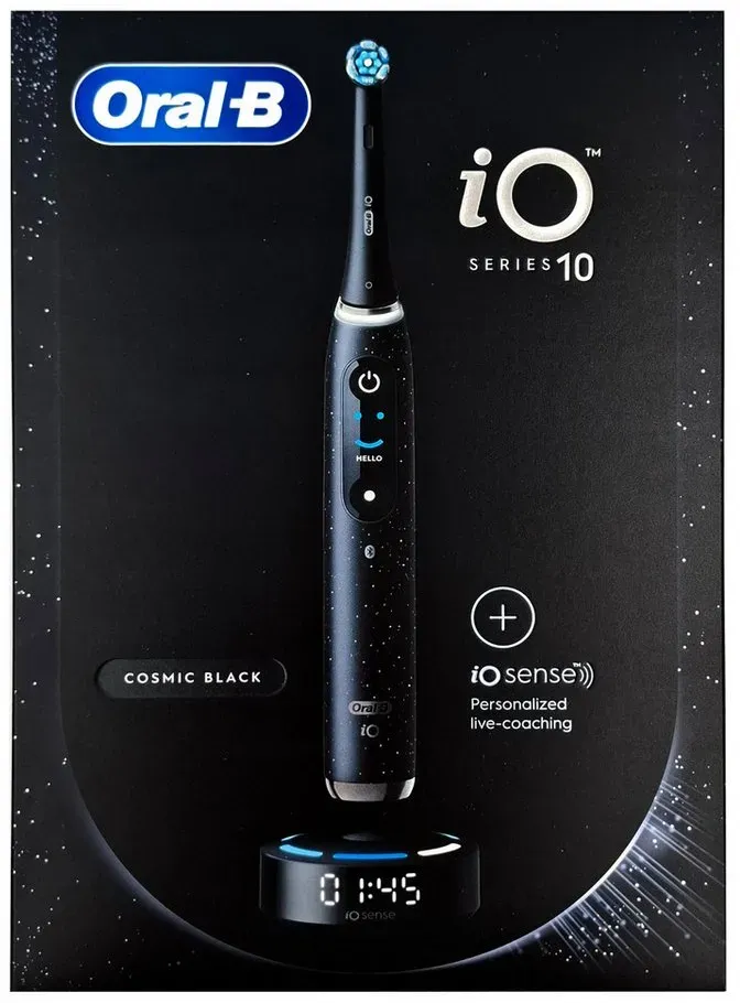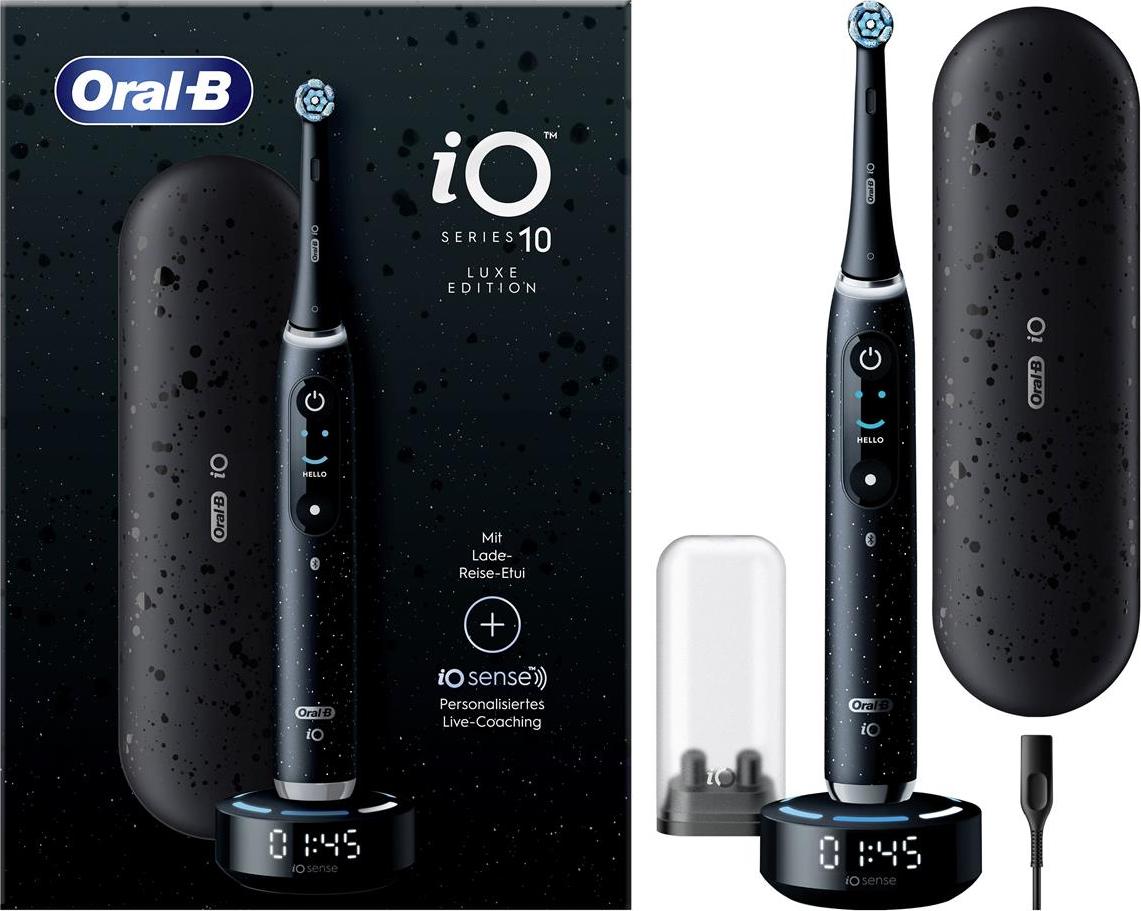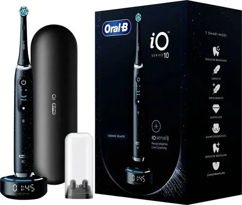 EAN: 4210201437307 - Oral-B | Elektrische Zahnbürste - iO Series 10 - Cosmic Black - Intelligente Reinigung - 7 ModiErleben Sie die revolutionäre Reinigung für ein strahlendes Lächeln!Intelligente Technologie für optimale MundpflegeDie Oral-B iO Series 10 in Cosmic Black ist nicht nur eine elektrische Zahnbürste, sondern Ihr persönlicher Zahnpflege-Assistent. Mit fortschrittlicher künstlicher Intelligenz analysiert die Zahnbürste Ihre Putztechnik und bietet Ihnen personalisierte Empfehlungen über einen interaktiven Farbdisplay. Diese intelligente Technologie hilft Ihnen, Ihre Mundhygiene zu optimieren und die besten Ergebnisse zu erzielen. Der integrierte Bluetooth-Support ermöglicht eine einfache Verbindung zur Oral-B-App auf Ihrem Smartphone, sodass Sie Ihre Fortschritte verfolgen und Ihre Putzgewohnheiten verbessern können.Vielfältige Putzmodi für individuelle BedürfnisseDie Oral-B iO Series 10 bietet Ihnen mit sieben verschiedenen Putzmodi eine maßgeschneiderte Reinigungserfahrung. Ob Sie eine sanfte Pflege für empfindliche Zähne und Zahnfleisch benötigen oder eine gründliche Reinigung für tiefere Bereiche wünschen, diese Zahnbürste hat für jeden Bedarf den passenden Modus. Die Modi umfassen unter anderem: 'Tägliche Reinigung', 'Sanfte Reinigung', 'Präzise Reinigung', 'Super sanfte Reinigung', 'Aufhellung', 'Zahnfleischpflege' und 'Zungenreinigung'. So können Sie jederzeit die optimale Pflege für Ihre Zähne auswählen.Schutz für Ihr Zahnfleisch und einfache Handhabung ... Dieses Angebot beinhaltet 3 Aufsteckbürsten und ist somit ideal für Nutzer, die gleich einen Vorrat wünschen. ![]() ![]() Oral-B iO Series 10 Elektrische Zahnbürste €” Electric Toothbrush, Inkl. 3 Aufsteckbürsten, iOSensen, Lade-Reise-Etui €” 7 Putzmodi für Zahnpflege, Zahnbürste Elektrisch, Designed by Braun, Weiß