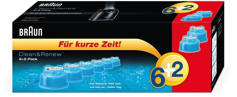 17 Händlerangebote bei billiger.de - Kategorie: Rasierzubehör - Braun - Pflegende öle schonen und schützen die Klinge Umweltfreundlich Einfach austauschbar 5+1 Vorteilspack - GTIN:4210201195351 Dieses 6+2er-Pack ist eine limitierte Edition und bietet eine große Menge zu einem guten Preis. ![]() ![]() Braun Clean&Renew Reinigungskartusche 6+2 (8er-Pack) (limitierte Edition)