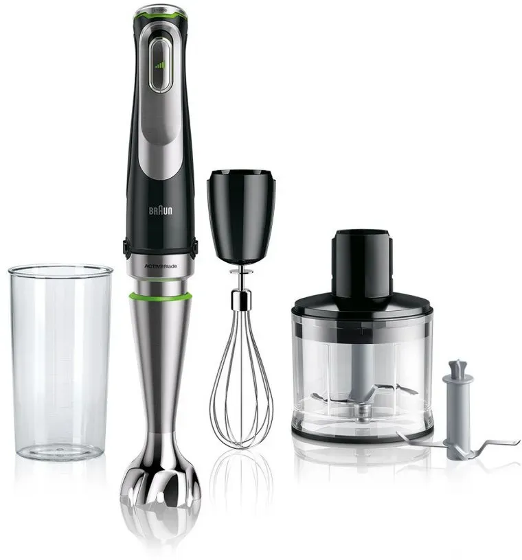 Zustand: Gebraucht - Stabmixer Elektrische Stabmixer - Braun De'Longhi - MQ 9147X 0X22111377 - EAN: 8021098775153 - 5 KÜCHENHELFER IN EINEM: Pürierstab, Standmixer-Aufsatz, Schneebesen, Kartoffel- & Gemüsestampfer und Zerkleinerer - dank des EasyClick Plus Systems kannst du mit nur einem Klick schnell und einfach zwischen den Aufsätzen wechseln WENIGER KRAFTAUFWAND: Dank der ActiveBlade Technologie, bei der sich die Messerklinge auf- und abwärts bewegen lassen, wird die Schneidoberfläche vergrößert und es können selbst härteste Lebensmittel mit bis zu 40 % weniger Kraftaufwand püriert werden INTUITIVE GESCHWINDIGKEITSEINSTELLUNG: Mit der Advanced SmartSpeed Technologie bestimmst du intuitiv per Tastendruck die Geschwindigkeit - zudem stehen dir 3 Leistungsbereiche, hoch, mittel und Impuls, zur Verfügung SAUBERES ARBEITEN: Das SplashControl Design der Mixglocke sorgt für saubere Kleidung und eine saubere Küche IM LIEFERUMFANG ENTHALTEN: 1 x MultiQuick 9 MQ 9147X, mit Pürier-Aufsatz, Schneebesen, Kartoffel- und Gemüsestampfer, Standmixer-Aufsatz, 350 ml Zerkleinerer und 600 ml Mix- & Messbecher (die meisten Teile sind spülmaschinenfest) - 5 Händler im amazon.de Marketplace Ein sehr preiswertes Angebot für ein Modell mit 1200 Watt und nützlichem Zerkleinerer sowie Messbecher. ![]() ![]() BRAUN MultiQuick 9 MQ 9138XI Stabmixer Premium-Schwarz/Edelstahl (1200 Watt, 500 ml Zerkleinerer, 600 Messbecher)