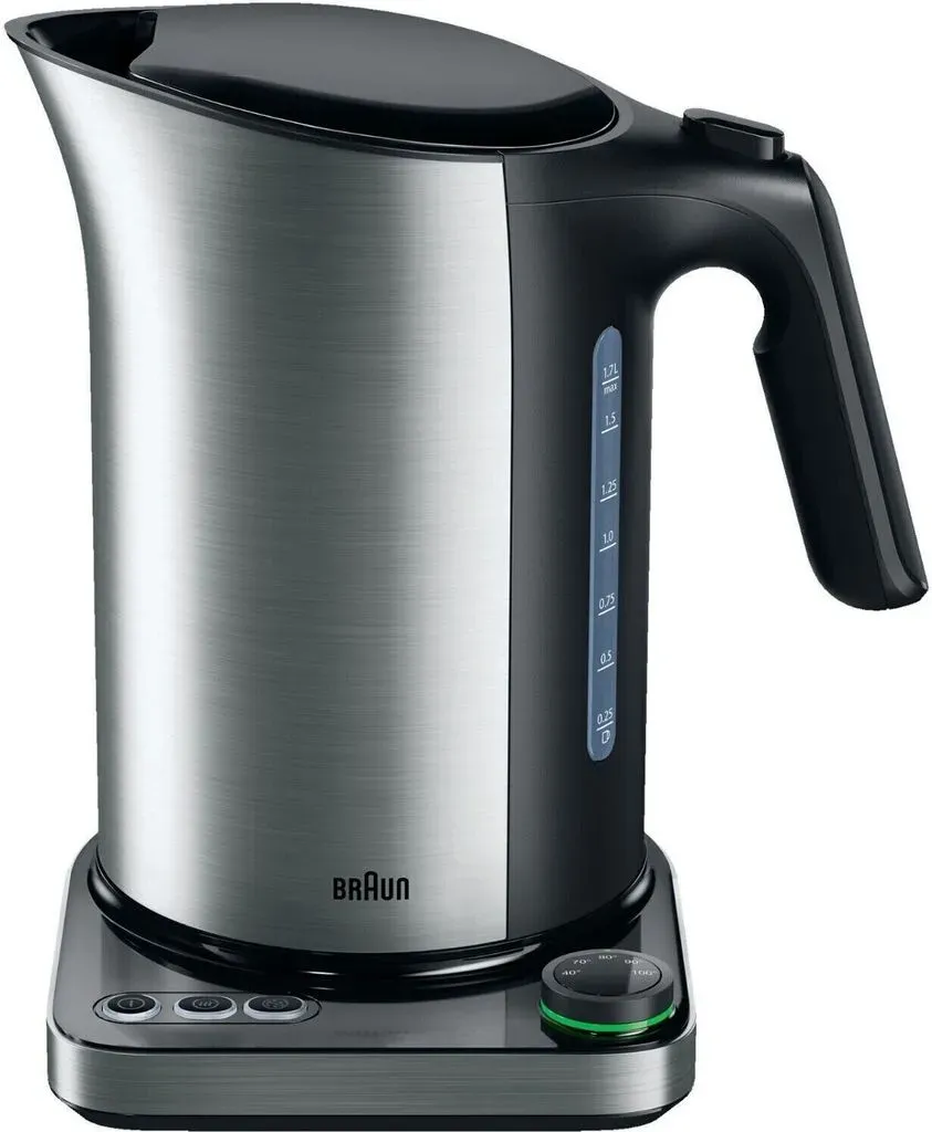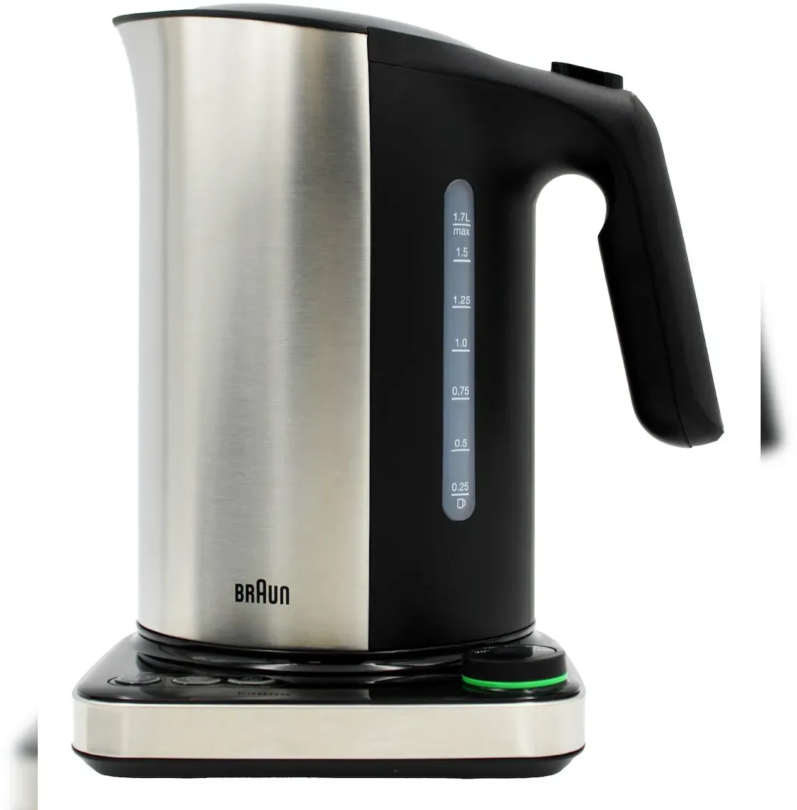 12 Händlerangebote bei billiger.de - Kategorie: Wasserkocher - Braun - Tailored Temperature: Jedes Getränk besitzt für die Entfaltung des vollen Geschmacks seine ideale Temperatur, weshalb Sie ganz einfach aus 5 Temperatureinstellungen wählen können, um stets den perfekten Wärmegrad für Ihren Tee oder Filterkaffee zu finden. Mit Warmhaltefunktion: Nach Erreichen der gewünschten Temperatur oder wenn der Kocher leer ist, schaltet sich das Gerät automatisch ab, hält jedoch Ihr Wasser bis zu 30 Minuten auf der voreingestellten Temperatur warm. Für eine lange Lebensdauer: Der benutzer e Teekocher ist mit einem herausnehmbaren, waschbaren Anti-Kalk Filter ausgestattet, während Sie die integrierte Entkalkungsanzeige automatisch daran erinnert, wann eine Entkalkung notwendig wird. Durchdachtes Design: Der Wasserkocher lässt sich über den Deckel oder die breite Ausgussöffnung befüllen, während Sie auf beidseitiger Wasserstandsanzeige den aktuellen Füllstand sehen und mit der 1-Tassen Anzeige energiesparend auch nur genau die Menge, die für eine Tasse Tee benötigt wird, kochen können. Lieferumgang: 1 x Braun IDCollection Wasserkocher WK 5115 in Schwarz. ID Collection: Entdecken Sie die ganze Kollektion mit der passenden Kaffeemaschine KF 5105, dem zugehörigen Wasserkocher WK 5115 und dem Toaster HT 5010 - GTIN:8021098773487 ![]() ![]() Braun IDCollection WK 5115 schwarz Wasserkocher - Silber