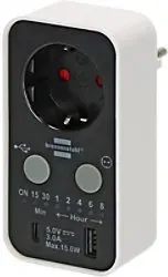 Messtechnik und Werkstattbedarf Elektromaterial und Elektroinstallation Steckdosen Verlängerungen Mehrfachsteckdosen Zwischensteckdosen Elektronik und elektronische Komponenten - EAN:4007123600656 - Extra großes Display für Wochentage, Stunden im 12 und 24 Stunden-Format, Minuten und Sekunden, sowie für die Betriebsart.20 Ein-/Aus-Programme mit Wochentag-, Stunden- und Minuten-Einstellung.einfache 4-Knopf Bedienung.kürzeste Schaltzeit 1 Minute.Countdown-Funktion.Zufallsfunktion.Sommer-/Winterzeit umschaltbar.manuelle Ein-/Aus-Funktion.unterbrechen laufender Programme möglich.Datenspeicher bei Stromausfall.praktischer Gehäuseaufbau. Bei Schalter-Steckdosen Kombinationen wird der Lichtschalter durch das Timergehäuse nicht verdeckt.Steckdose mit erhöhtem Berührungsschutz und Deckel für Spritzwasserschutz.inklusive NiMH-Akku. - gefunden von Kelkoo Dieser digitale Countdown Timer mit USB A und USB C Anschlüssen ist ideal für moderne Geräte und bietet zusätzliche Ladefunktionen. ![]() ![]() Brennenstuhl Digitaler Countdown Timer mit USB A und USB C (Timer-Steckdose für den Innenbereich, Countdown in 7 Stufen einstellbar, mit erhöhtem Berührungsschutz)