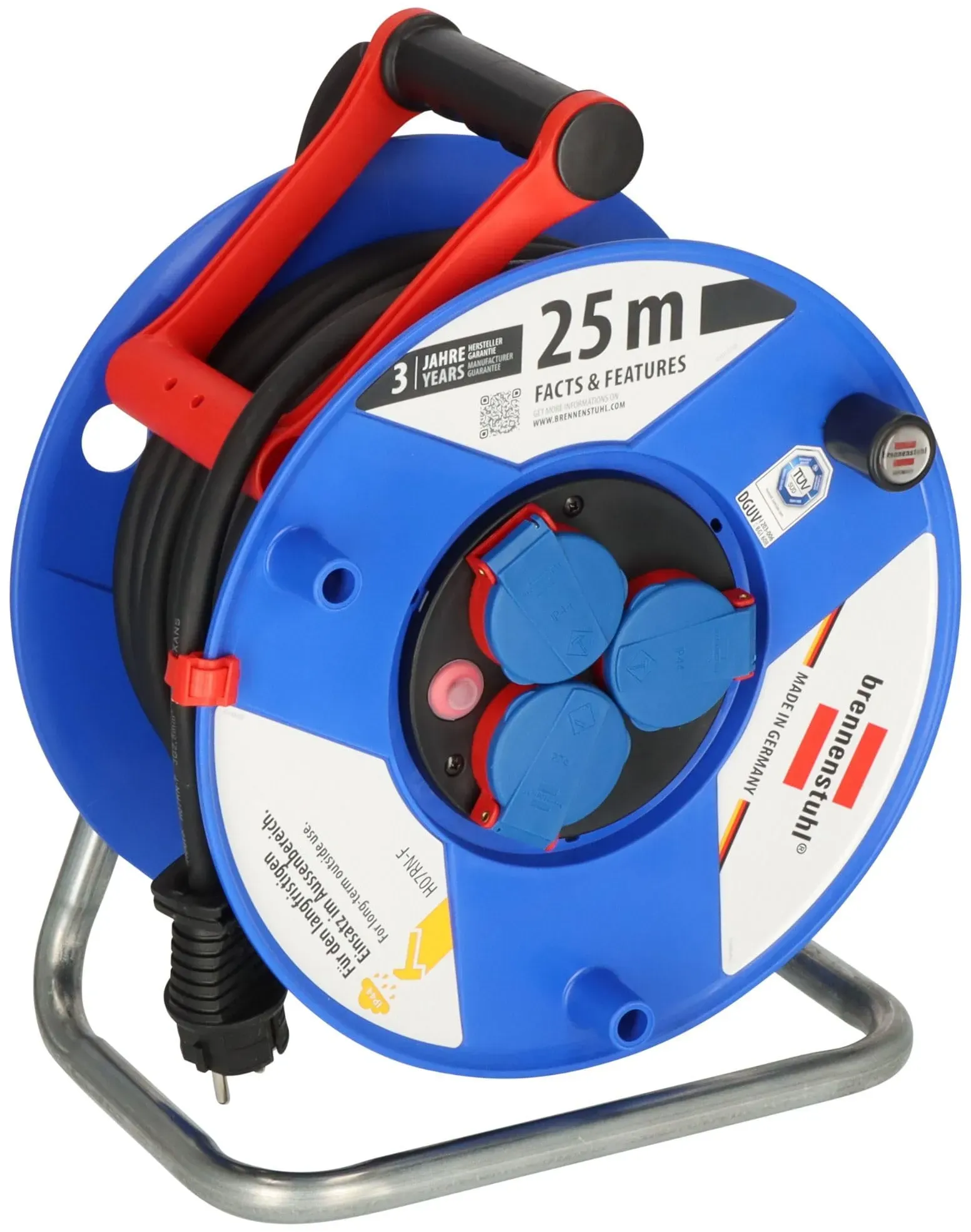 Kategorie: Kabeltrommeln - Brennenstuhl - GTIN:4007123007356 - Die Brennenstuhl Kabeltrommel Garant hat eine Kabellänge von 25 m (H05VV-F 3G1,5) und einen Trommelkörper aus Spezialkunststoff. Sie ist für innen geeignet und verfügt über 4 Steckdosen mit selbstschließenden Deckeln. Zur Sicherheit ist ein überhitzungsschutz und eine Kontroll-Leuchte bei überhitzung und überlastung verbaut. Ein ergonomischer Handgriff mit Achse sorgt für eine perfekte Kabelführung beim Auf- und Abrollen. - 44,99 Euro bei BAUHAUS - gefunden von billiger.de Diese Kabeltrommel ist mit 64,49 Euro eine preiswerte Option für den kurzfristigen Einsatz im Außenbereich dank IP44 Schutz. ![]() ![]() Brennenstuhl Garant S IP44 Kabeltrommel, 25m Kabel in orange