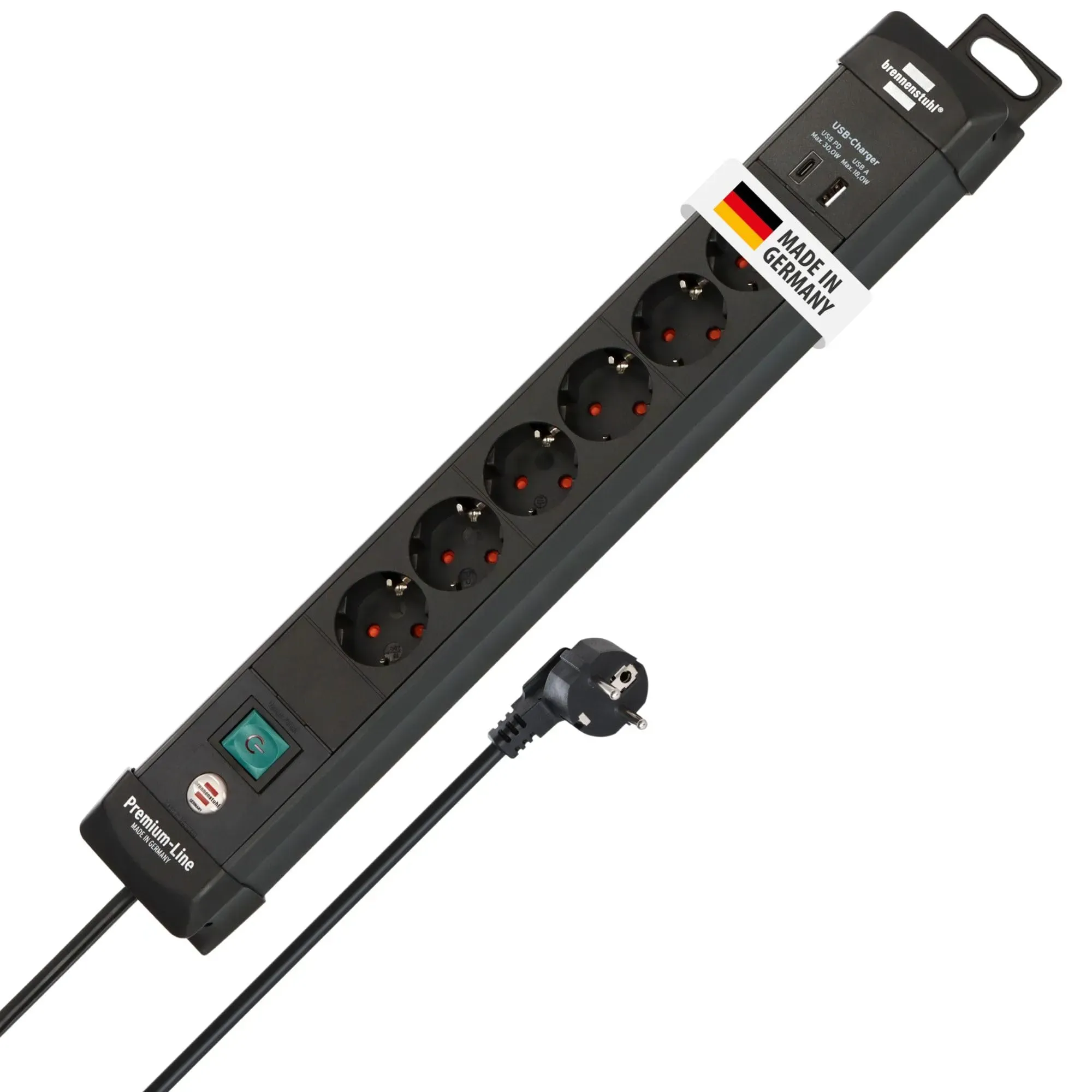 Kategorie: Steckdosen - Brennenstuhl - GTIN:4007123662975 - Eigenschaften: Die Premium-Line 6er Mehrfach-Steckdosenleiste von Brennenstuhl in der Farbe schwarz, mit 2 USB-Ladebuchsen und 3m Kabel besticht durch ihre Qualität und Sicherheit in allen Bereichen. Ihr formschönes und stabiles Gehäuse besteht aus hochbruchfestem Spezial-Kunststoff. Sie verfügt nicht nur über einen erhöhten Berührungsschutz, sondern überzeugt außerdem durch folgende Eigenschaften: Schutzkontakt-Steckdosen in 45 -Anordnung, auch für Winkelstecker Sicherheitsschalter beleuchtet, zweipolig ein-/ausschaltbar Praktische Kabelaufnahme Mit Aufhänge-Vorrichtung Innovatives Befestigungskonzept 2 USB Ladebuchsen Gesamtladestrom max. 3100 mA für schnelles Aufladen 6er Schutzkontakt-Steckdosenleiste mit 2 USB Ladebuchsen (Gesamtladestrom max. 3100 mA für schnelles Aufladen), 3m Kabellänge (H05VV-F 3G1,5) und erhöhtem Berührungsschutz Stabile, schlichte Kompaktleiste aus hochbruchfestem Spezial-Kunststoff Steckdosenleiste mit beleuchtetem Sicherheitsschalter zum Ein- und Ausschalten (zweipolig) Mehrfachstecker mit innovativer Aufhänge-Vorrichtung zur Wandmontage und praktischer Kabelaufnahme Lieferumfang: Premium-Line Steckdosenleiste mit USB-Ladebuchsen in der Farbe schwarz - in bester Qualität von brennenstuhl - 33,49 Euro bei Contorion.de - gefunden von billiger.de Eine Steckdosenleiste mit Überspannungsschutz bis 26.000 A, die einen guten Schutz für Ihre Geräte bietet. Bueroshop2 4.de brennenstuhl Premium-Line 6-fach Steckdosenleiste mit Überspannungsschutz 1,8 m schwarz