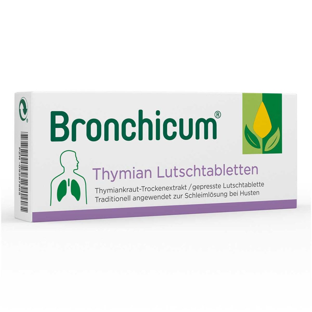 0,17 €/Stück - Kategorie: Arzneimittel - Klosterfrau - GTIN:4008617519362 - PZN:09287865 - Bronchicum® Thymian Lutschtabletten. Keine Zeit für Husten. Höchste Zeit für uns. Mit wertvoller Rezeptur aus Thymianextrakt Zur Unterstützung der Schleimlösung im Bereich der Atemwege Einfach im Mund zergehen lassen Sehr gut verträglich Praktisch für unterwegs laktosefrei, glutenfrei, vegan Bronchicum® Thymian Lutschtabletten, ein pflanzlicher Hustenlöser bei erkältungsbedingtem Husten, enthalten die Kraft der Arzneipflanze Thymian. Bronchicum® Thymian Lutschtabletten lindern typische Husten-Symptome und erleichtern das Abhusten. Bronchicum® Thymian Lutschtabletten sind ideal für unterwegs. Sie sind für Erwachsene und Kinder ab n geeignet. Für Kinder ab 6 Monaten eignet sich das Bronchicum® Elixir und für die kleinsten Hustenpatienten eignet sich bereits ab dem 1. Lebenstag der Bronchicum® Thymian Hustensaft. Thymian: traditionell bewährt bei Atemwegserkrankungen. Thymian gehört zu den traditionell angewandten Heilkräutern, die gleich mehrere Wirkungen entfalten. Er findet vor allem Anwendung bei Erkältungen mit Husten bzw. Bronchitis. Die ätherischen öle des Thymians wirken schleimlösend und auswurffördernd. Sie erleichtern das notwendige Abhusten und haben eine entkrampfende Wirkung auf die Bronchien. Thymian wird zwar schon seit dem Mittelalter bei Atemwegserkrankungen eingesetzt, seine vielfältigen Wirkungen und Einsatzgebiete regen jedoch bis heute die Forschung an. Husten – ... ![]() ![]() Klosterfrau Bronchicum Thymian Lutschtabletten 20 St