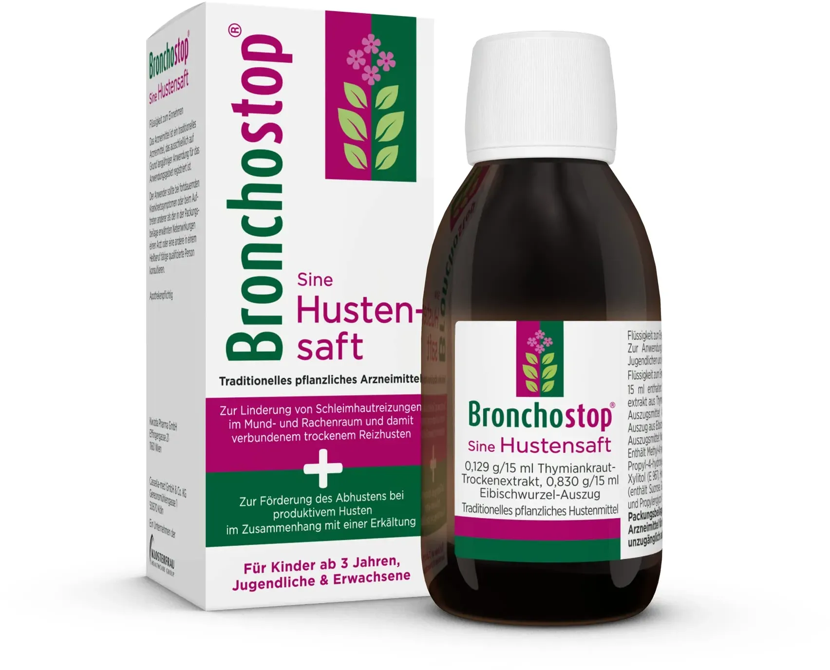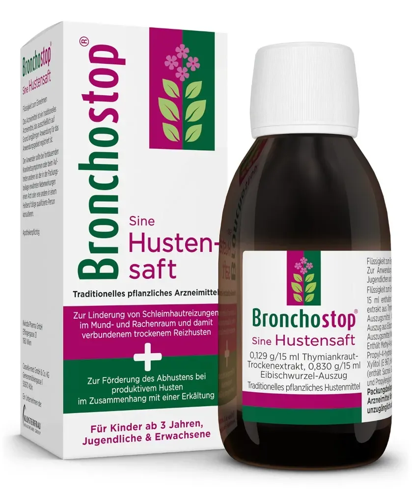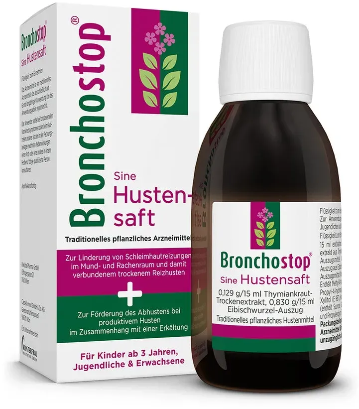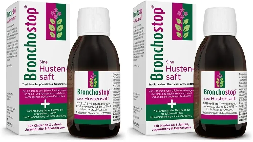 Bronchostop META PreisvergleichMit dem Meta-Preisvergleich suchen Sie gleichzeitig bei den großen Preisvergleich Portalen!Jetzt live Suche nach bronchostop starten! Bronchostop KaufberatungBRONCHOSTOP - Kaufberatung und ProduktübersichtBRONCHOSTOP Sine Hustensaft ist ein traditionelles pflanzliches Arzneimittel zur Hustenbehandlung, das von der Kwizda Pharma GmbH hergestellt wird.[1][3] Das Produkt ist in verschiedenen Darreichungsformen und Größen erhältlich und erfreut sich großer Beliebtheit im deutschsprachigen Raum. Anwendungsgebiete und WirkungBRONCHOSTOP Sine Hustensaft wird traditionell angewendet zur Linderung von Schleimhautreizungen im Mund- und Rachenraum mit trockenem Reizhusten und zur Förderung der Schleimlösung bei Husten mit Schleimbildung im Zusammenhang mit einer Erkältung.[1][5] Die Kombination aus Thymian und Eibisch beruhigt gereizte Schleimhäute und fördert gleichzeitig das Abhusten von Schleim aus den Bronchien, ohne den Hustenreflex komplett zu unterdrücken.[3][7] Verfügbare ProduktvariantenDie BRONCHOSTOP-Serie bietet mehrere Optionen: