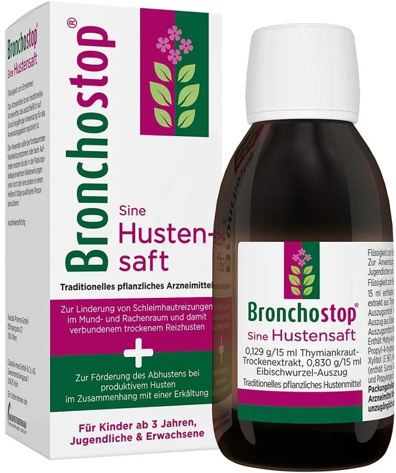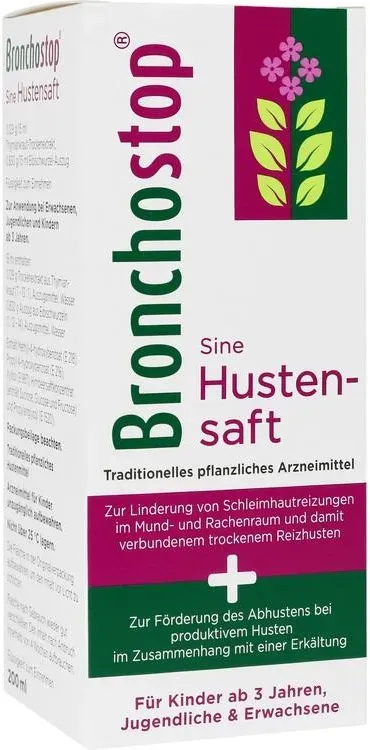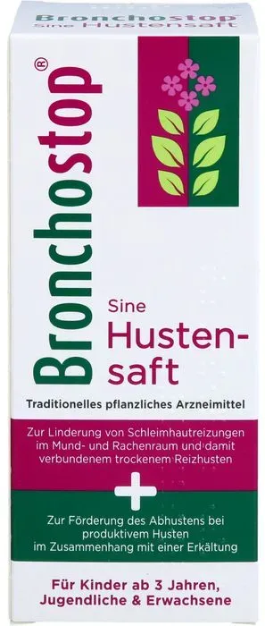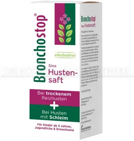 Verfügbarkeit: 1-2 Werktage - 30,95 €/l - Kategorie: Arzneimittel - Klosterfrau - GTIN:4150166202360 - PZN:16620236 - * Pflanzliches Arzneimittel * Lindert den Hustenreiz im Rachenraum und hat schleimlösende Eigenschaften * ohne Ethanol - 6,19 Euro bei fliegende-pillen.de - gefunden von billiger.de Dieses Angebot auf Amazon.de ist mit 7,30 Euro sehr preiswert und bietet den beliebten Bronchostop Sine Hustensaft. ![]() ![]() Bronchostop Sine Hustensaft | eine gute Wahl bei Husten | 200 ml | lindert den Hustenreiz und fördert das Abhusten | pflanzlich, ethanolfrei & vegan | geeignet ab 3 Jahren