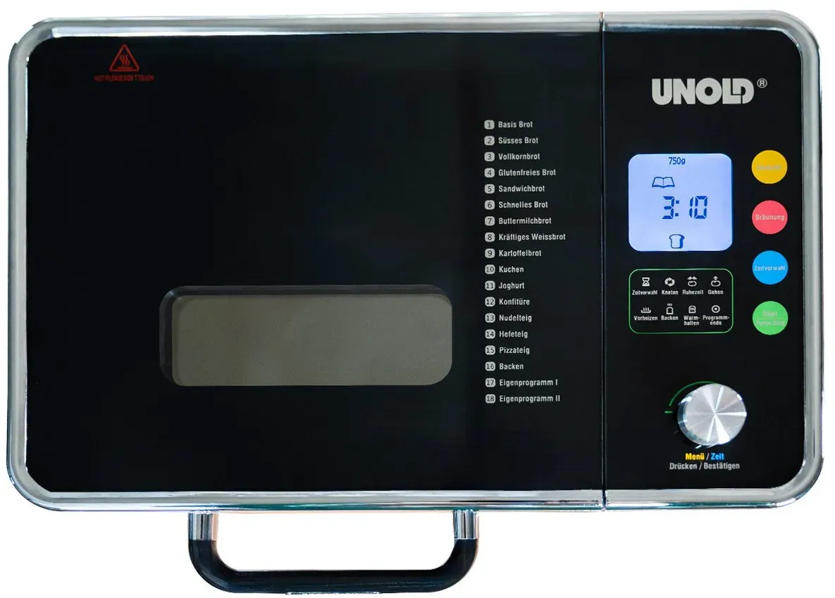 119.99 /1Stk - Kategorie: Brotbackautomaten - Unold - GTIN:4011689684760 - Programme & Funktionen Anzahl voreingestellter Programme , 18, Farbe & Material Farbe , Edelstahl, Material Gehäuse , Kunststoff Edelstahl Glas, Maße & Gewicht Gewicht , 6,1 kg, Technische Daten Leistung , 600 W, WEEE-Reg.-Nr. DE , 39547139, Handhabung & Komfort Art Bedienung , Drehregler Touchscreen, Eigenschaften Deckel , Deckel mit Sichtfenster, Ausstattung Anzahl Backformen , 1, Mitgeliefertes Zubehör , Backform Kneter Messbecher Messlöffel Hakenspieß Rezeptheft, Verarbeitungsmengen Verarbeitungsmenge Brotteig minimal , 0,5 kg, Verarbeitungsmenge Brotteig maximal , 1 kg, - 119,99 Euro bei OTTO - gefunden von billiger.de Der Eta Delicca II Max ist eine leistungsstarke Maschine mit großem Fassungsvermögen und vielen Programmen für vielfältige Brotsorten. ![]()