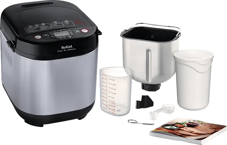 Kategorie: Brotbackautomaten - Tefal - GTIN:3045385783428 - Genuss und Gesund in einem, mit dem Pain & Delices Brotbackautomaten von Tefal! Genießen Sie frisches Brot nach Ihrem Belieben. Mit dem Tefal Brotbackautomaten müssen Sie sich nicht länger zwischen Geschmack und Gesund entscheiden! Der Tefal Brotbackautomat ist ideal für glutenfreie Ernährung oder gesundheitsbewusste Menschen. Im Handumdrehen frisches Brot backen, das ganz persönlich auf Sie zugeschnitten ist. 20 automatische Programme, für Brot, Brioche und mehr, inklusive 3 glutenfreie Programme. Lassen Sie außerdem Ihrer Fantasie freien Lauf und stellen Sie dank der speziellen Programme auch Pasta, Porridge, Müsli und Marmelade her. Mit dem Pain & D lices von Tefal geht alles ganz automatisch und praktisch. Die verzögerte Startfunktion hilft Ihnen dabei genau dann frisches Brot zu genießen, wenn Sie es wollen. Zutaten in die Brotbackform, Programm auswählen und der Brotbackautomat arbeitet für Sie von Kneten bis Backen. Auch die Reinigung danach gestaltet sich ganz einfach, dank der herausnehmbaren, antihaftbeschichteten Backform. - 109,99 Euro bei Media Markt Online Shop - gefunden von billiger.de Mediamarkt .de Tefal PF240E Pain & Délices (Brotbackautomat, Schwarz/Edelstahl)