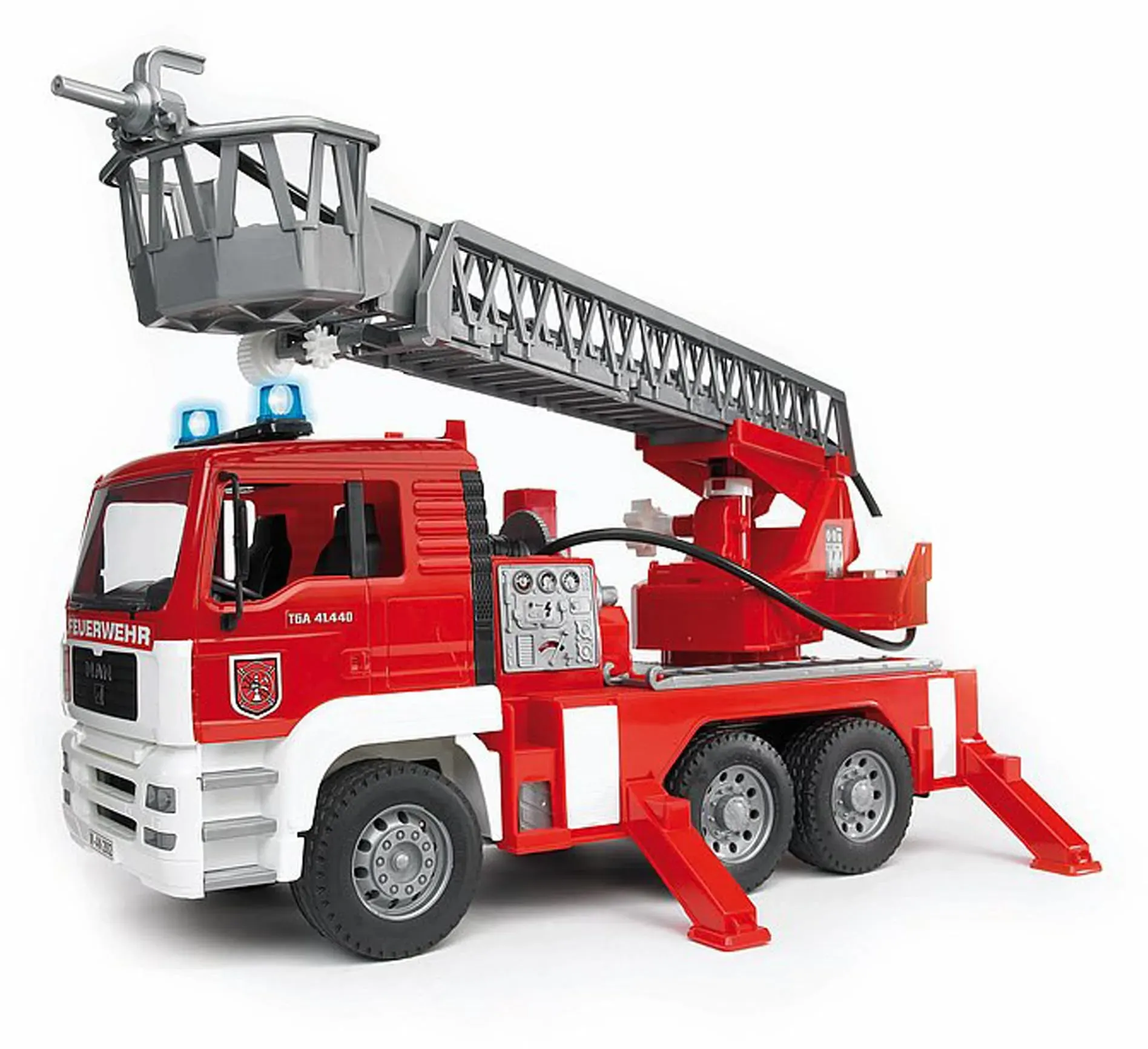 25 Händlerangebote bei billiger.de - Kategorie: Modellfahrzeuge - Bruder - Deine Feuerwehr sollte bei einem Brand, ob Haus- oder Waldbrand, nicht ohne den LKW mit der Drehleiter los fahren. Das Fahrerhaus des LKWs ist kippbar und gibt den Blick auf den Motorraum frei. Der Kranaufsatz ist um 360° schwenkbar, besitzt eine Werkzeugbox und vier Stützblöcke, um für Stabilität beim Einsatz zu sorgen. Der Kranarm ist ein- und ausfahrbar. Die Seilwinde ist voll funktionstüchtig und bei brenzlichen Situationen kann die Leiter über die Entsicherungstaste schnell herunter gelassen werden. Das Modell ist mit einem Light and Sound Modul und den dazugehörigen Batterien ausgestattet und verfügt dadurch über eine Sirene und vier weitere Funktionen. Nach 18 Sekunden wird es automatisch ausgeschaltet. Der hochwertige Kunststoff sorgt für langanhaltenden Spielspaß. - GTIN:4001702027711 Dieses Angebot bietet das Modell mit Drehleiter, Wasserpumpe und Licht- und Soundmodul zu einem attraktiven Preis. ideeundspi el.com BRUDER DIE PROFI SERIE BRUDER 02771 MAN TGA Feuerwehr mit Drehleiter, Wasserpumpe und Licht und Sound Modul