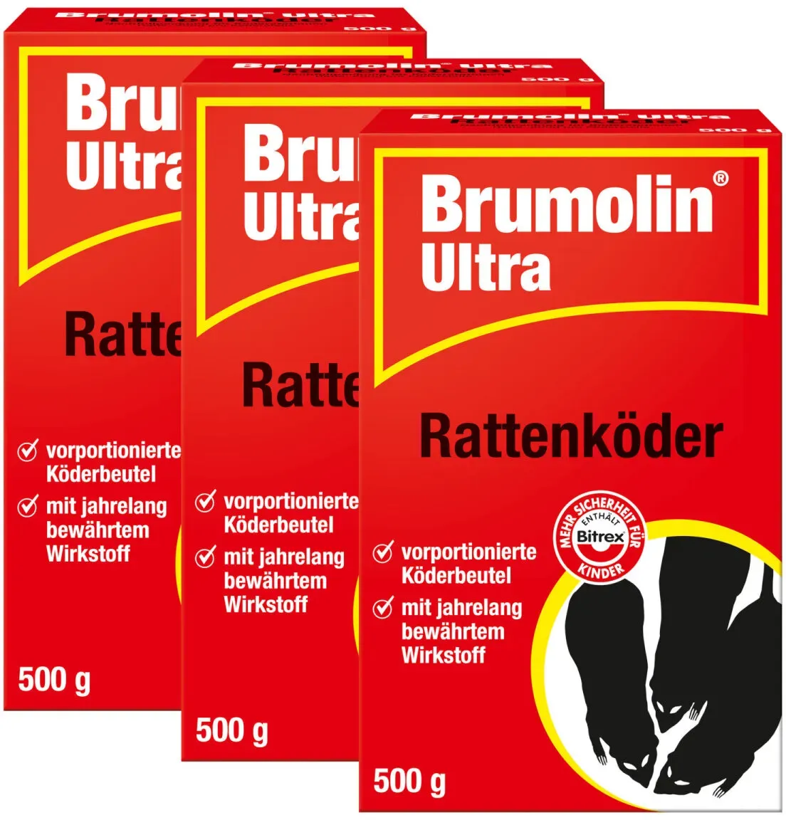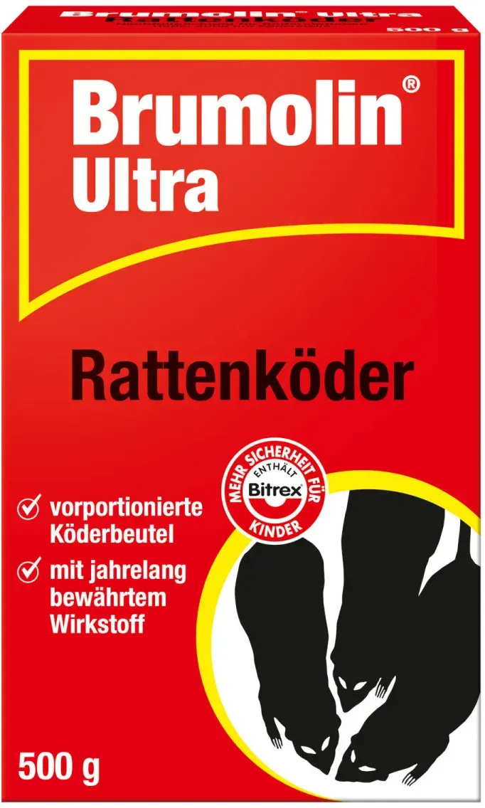 Brumolin ultra META PreisvergleichMit dem Meta-Preisvergleich suchen Sie gleichzeitig bei den großen Preisvergleich Portalen!Jetzt live Suche nach brumolin ultra starten! Brumolin ultra KaufberatungBrumolin Ultra ist ein vorportionierter Rattenköder mit dem Wirkstoff Coumatetralyl, der zur Bekämpfung von Ratten im Haus und um Gebäude eingesetzt wird. Er ist für nicht-berufsmäßige Verwender zugelassen und wird in 500-g-Packungen angeboten[1][3][4]. Wichtige Punkte, die Sie beachten sollten: