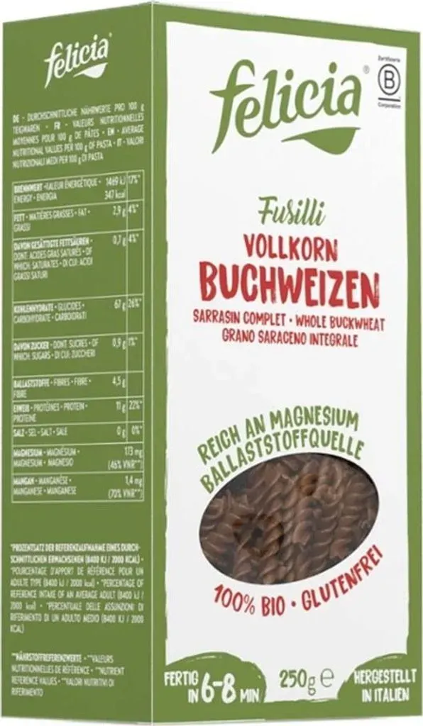 3 Händlerangebote bei billiger.de - Kategorie: Nudeln - Felicia - Ihre Kund:innen lieben Pasta in allen Farben und Formen? Nachhaltigkeit ist Ihnen wichtig und ein Familienunternehmen ist Ihnen lieber als ein Konzern? Dann passt Felicia sehr gut in Ihr Sortiment. Seit 1 n bietet die Marke eine große Vielfalt an Pastasorten an aus natürlich glutenfreien Getreiden, Pseudogetreiden und Hülsenfrüchten. Unser Angebot ist das vielfältigste auf dem Markt, denn wir wissen: Geschmäcker sind verschieden. Unsere Buchweizenpasta schmeckt fein nussig und enthält mehr als doppelt so viel Eiweiß wie konventionelle Weizennudeln, was sie besonders beliebt bei Endkund:innen macht. Sie ist ideal für alle, die Wert auf eine ausgewogene Energie- und Mineralstoffquelle legen. Felicia wird vom italienischen Familienunternehmen Andriani SpA produziert. Ziel der Firma ist es, bis 2025 klimaneutral zu sein. Dafür wird viel getan: Industrielle Nebenprodukte werden zum Beispiel verwendet, um Methan und Biomasse zu gewinnen oder um Spirulina Algen zu züchten. Andriani SpA kombiniert gesellschaftlichen Nutzen mit Wirtschaftlichkeit und ist daher seit 2021 auch eine zertifizierte B-Corporation. Möchten Sie mehr über Felicia und Andriani Spa erfahren? Folgen Sie uns auf Facebook und Instagram oder besuchen Sie unsere Website www.felicia-bio.de. - GTIN:8032804431836 Felicia Buchweizen Fusilli ist eine beliebte Wahl und bei Kaufland.de erhältlich. ![]() ![]() Felicia Buchweizen Fusilli 250g