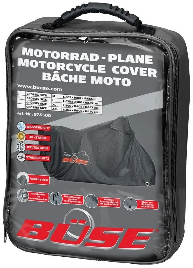 Kategorie: Sonstiges Autozubehör - BüSE - GTIN:4051218382491 - Büse Abdeckplane Outdoor wasserdichte Abdeckplane kälte- und wärmestabil Sichtfenster für Nummernschild textiles Innenfutter als Lackschutz Befestigungsriemen mit Clipschloss ösen zur Sicherung mit Schloss praktische Aufbewahrungstasche mit Griff Größen: M (L:203 x B:89 x H:122 cm) L (L:232 x B:100 x H:125 cm) XL (L:246 x B:105 x H:127 cm) XXL (L:264 x B:105 x H:130 cm) - 48,60 Euro bei motorun.de - gefunden von billiger.de ![]() ![]() BÜSE Büse Abdeckplane Outdoor II, schwarz, Größe XL