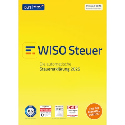 Buhl Data Service - EAN: 4011282006259 - Nur hier: Steuer automatisch ausgefüllt. Intelligente Datenübernahme aus der Vorjahresversion, automatisch vorausgefüllte Erklärung mit Daten vom Finanzamt und aus dem Bankkonto, papierlose Abgabe auch ohne eigenes ELSTER-Zertifikat, KI-Chatbot SteuerGPT und vieles mehr. Steuern sparen: über 150 Videos mit Tipps, umfangreiche Steuerspar-Hilfe, exakte Berechnung der Erstattung, Steuerbescheid-Prüfer, Planspielmodus, Antrag auf Lohnsteuer-Ermässigung und vieles mehr. Komfort: Abgabe der Steuererklärung mit ELSTER oder als Ausdruck, automatische Bescheidprüfung mit Einspruchsvorschlag, Vorlagen und Musterschreiben, Schnell-Rechner für Netto-Gehalt, Auswahl der günstigsten Steuerklasse, Erbschaft, Riester und vieles mehr. Leistungsmerkmale: Erledigt die Einkommensteuer-Erklärung 2025 mit allen Einkunftsarten und Formularen. Abgabe der Steuererklärung als amtlich anerkannter Ausdruck oder per Internet (ELSTER). Für Selbstständige: Einnahmen-überschuss-Rechnung, Umsatzsteuer-Voranmeldung, Umsatz- und Gewerbesteuer-Erklärung, Lohnsteuer-Anmeldung, Fahrtenbuch. Feststellungserklärung 2025 für Erbengemeinschaften und BGB-Gesellschaften. Steuererklärung mit KI-Unterstützung durch interaktiven Chatbot. Hunderte Steuertipps. über 150 Videos mit Tipps rund um die Steuererklärung. Sofortige Anzeige der Erstattung/Nachzahlung nach jeder Eingabe. Automatischer Vergleich des amtlichen Steuerbescheids mit der Programmberechnung. Musterschreiben für ... ![]() ![]() Buhl Data WISO Steuer 2026 | Download & Produktschlüssel