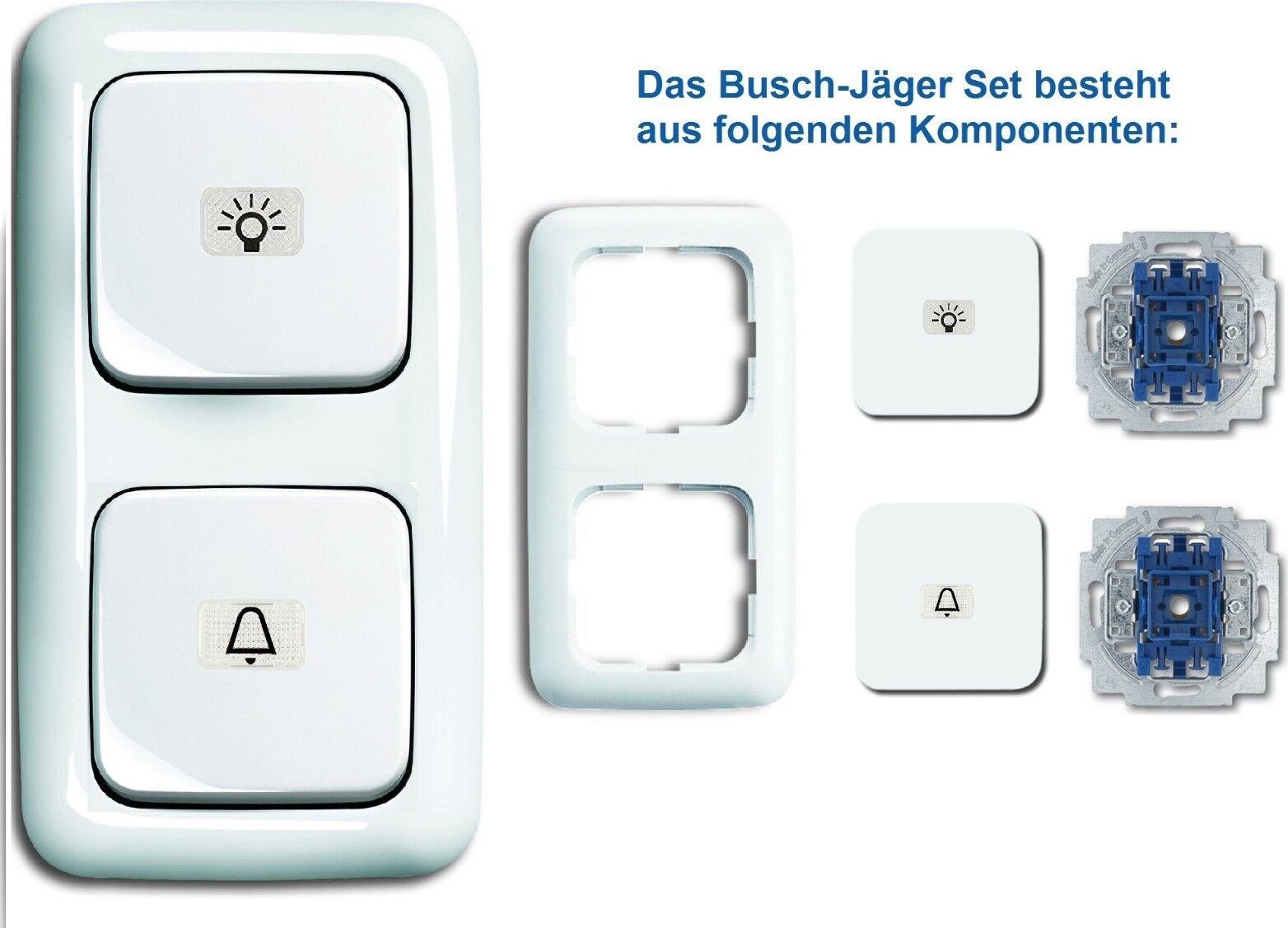 Zustand: Neu - Türklingeln & Türglocken - EBROM's BJ Sets Busch Jäger - 4065641022473 - EAN: 4065641022473 - Busch-Jaeger (Original) Komplettset 1 x Klingel beleuchtet (Taster, klassische Klingel) 1 x Lichtschalter/Wechselschalter (AN/AUS) 2 x mit transparenter Kalotte mit Symbol 'Licht' und Symbol 'Klingel' beide mit Beleuchtung Inklusive 2 fach Rahmen Alpinweiß - Reflex SI - Verkäufer: EBROM ® im amazon.de Marketplace Dieses Set bietet ein gutes Preis-Leistungs-Verhältnis für eine Kombination aus Klingeltaster und Wechselschalter in alpinweiß. ![]() kaufland.d e Busch-Jaeger Busch Jäger Klingel & Lichtschalter Set, Glocken- & Klingel Symbol permanent beleuchtet - Taster 2020 USGL (Klingel) und Wechselschalter 2000/6 USGL (Wippe für Licht an/aus) - alpinweiß - Reflex SI 2020 USGL, 2000/6 USGL
