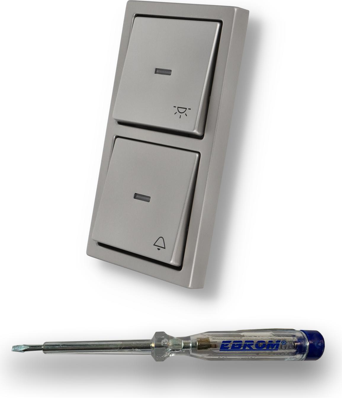 Zustand: Neu - Druckschalter - EBROM Busch Jäger / EBROM - Busch-Jäger-Licht-Klingel-Kombi - EAN: 4065641201892 - Busch Jäger Komplettset 1 x Klingel beleuchtet, 1 x Lichtschalter/Tastschalter beleuchtet 2 x mit transparenter Kalotte zur Darstellung des Orientierungslichts, die Symbole 'Licht' und 'Klingel' sind auf die Wippe aufgedruckt, inklusive 2-fach Rahmen in anthrazit Typ/Farbe der Zusammenstellung: Busch Future Linear anthrazit (181K) Einbaufertig für Sie zusammengestellt durch die Kabelprofis von EBROM inkl. EBROM Phasenprüfer zur einfachen Montage der Licht- und Klingel Kombination Hersteller Schalter Klingel, Wippen und Rahmen: BUSCH JÄGER; Hersteller Phasenprüfer: EBROM; EINE SET IDEE VON EBROM - Verkäufer: EBROM ® im amazon.de Marketplace Ein Set in Anthrazit mit Glocken- und Klingelsymbol, das eine moderne Optik und einen Phasenprüfer bietet. ![]() ![]() Busch Jäger Klingel & Lichtschalter Set, Glocken- & Klingel Symbol, Taster permanent beleuchtet – Typ 2020 USGL + Wippen mit Rahmen in anthrazit inkl. EBROM Phasenprüfer zur Montage der Geräte