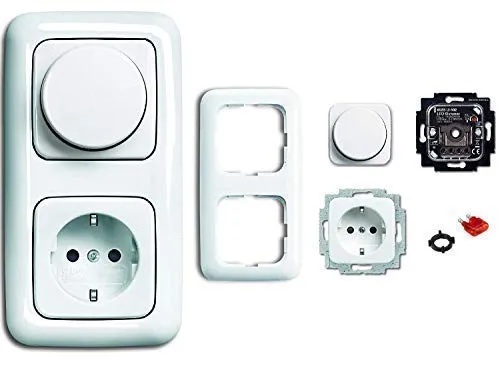 Kategorie: Schalter - EBROM's BJ Sets - GTIN:4251514723046 - Bestehend aus: LED Dimmer und Dimmerscheibe + 2-fach Rahmen + Steckdose Drehdimmer Typ: 6523 U-102, Inklusive rote Glimmlampe (Ring des Dimmers ist wenn 'AUS' rot beleuchtet, muss nicht zwingend eingebaut werden) Farbe/Design: Busch-Jaeger (Original) Reflex Si alpinweiß - 108,90 Euro bei Amazon Marketplace Automotive - gefunden von billiger.de Ein umfangreiches Komplett-Set mit 3-fach Rahmen, Steckdose mit Kinderschutz, Wippschalter und Wippe für maximale Funktionalität. ![]() ![]() EBROM's BJ Sets LED Dimmer KomplettSet BUSCH JäGER, Drehdimmer alpinweiß Reflex SI 6523-U 102 (6523 U-102) in 3fach Rahmen + Steckdose mit integriertem erhöhtem Berührungsschutz (Kinderschutz) + Wippschalter + Wippe
