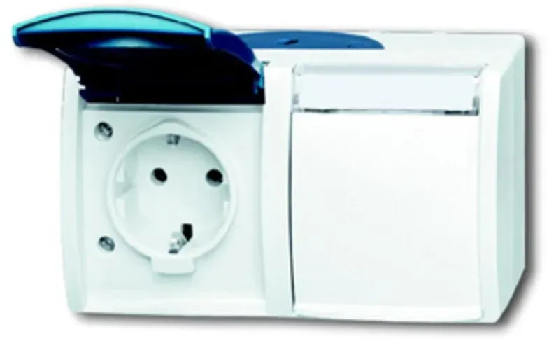 Kategorie: Steckdosen - Busch-Jaeger - GTIN:4008297102014 - Die Busch-Jaeger 2-fach Aufputz Steckdose aus der Serie Ocean ist eine spritzwassergeschützte Steckdose mit Klappdeckel. Sie eignet sich mit seiner Schutzklasse IP44 hervorragend in Feuchträumen, da sie spritzwasser- und staubgeschützt ist. Er besitzt eine zweifarbige Gestaltung in Blau und Grau. Außerdem ist sie mit seinem robustem Gehäuse, welches aus schlagzähem, witterungsbeständigem Spezialkunststoff besteht, für den Innen- und Außenbereich hervorragend geeignet. Die Steckdose wird Aufputz montiert und häufig in Kellern, Garagen oder überdachten Außenbereichen genutzt. Eine schnelle und unkomplizierte Installation bietet der große Anschlussraum des Gehäuses. Technische Daten: - Nennspannung: 230 V - Nennstrom: 16 A - Schutzklasse: IP 44 - Mit Steckanschluss 2P+E - 21,49 Euro bei OBI - gefunden von billiger.de Diese Kombination aus SCHUKO Steckdose und Wippschalter bietet eine flexible Lösung für verschiedene Anforderungen. ![]() ![]() Busch-Jaeger Kombination SCHUKO Steckdose, mit Wipp. 2601/5/20EW-54-503