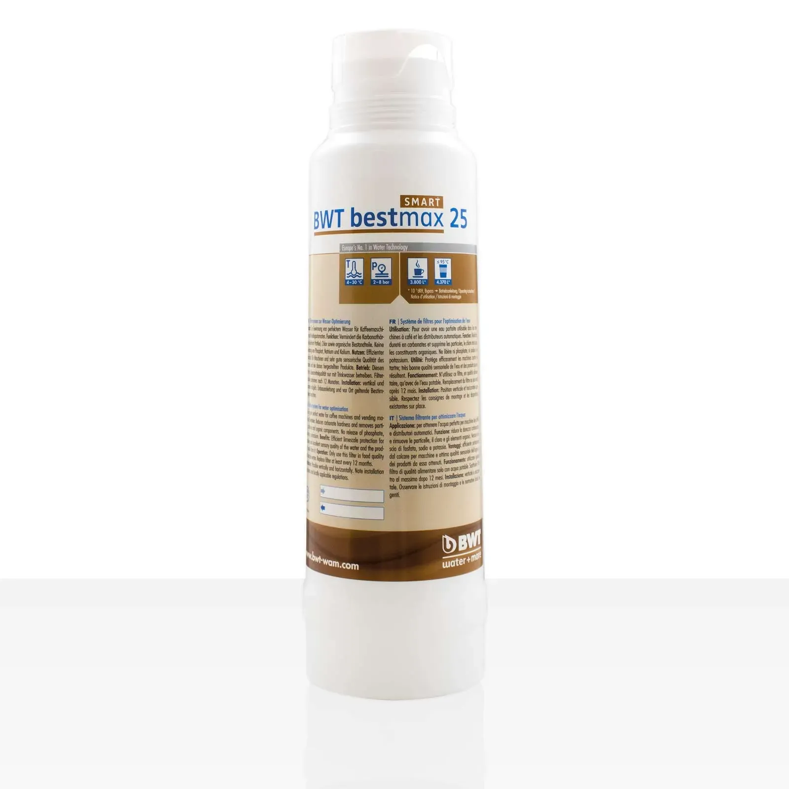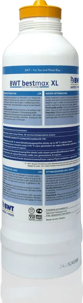 3 Händlerangebote bei billiger.de - Kategorie: Wasserfilter - BWT - Bestmax M Filterkerze, BWT water+more Größe M, Filterkapazität ca. 3800 Liter, ohne FilterkopfBestmax M sorgt durch Wasseroptimierung für den unvergleichlichen Geschmack von Kalt- und Heißgetränken. Mit der BWT Filterkerze können Sie Kalkablagerungen vorbeugen, denn der Wasserfilter sorgt dafür, dass die Vending-Automaten ein klares und reines Wasser zur Verfügung haben. Auch Spülmaschinen, Kombidämpfer und Co profitieren vom Einsatz der BWT Bestmax Filterkerze. Das Ergebnis sind strahlende Gläser ohne Schlieren, ein besserer Geschmack bei Gemüse und n. BWT bestmax ist die Allround-Filtrationslösung, für einzigartiges Kaffeewasser, ideales Wasser für Vending-Geräte und optimalen Reindampf für Backöfen und Kombidämpfer. Noch wirksamer wird die Wasseroptimierung dank neuer High-Efficiency-Technology (HET) der BWT Bestmax Filter für gleichbleibend hohe Qualität aller Heiß- und Kaltgetränke Speisen und n. -Filterkapazität ca. 3800 Liter (10 °dKH/Verschnitt 3) -Maße: Höhe: ca. 475 mm, Ø 130 mm, Anschluss 3/8 -einfachste Handhabung beim Filtertausch -horizontal und vertikal einsetzbar -automatischer Wasserstopp beim Filtertausch -umständliche Einspülen unnötig -5-fach-Filtration -hocheffizienter Kalkschutz auch für Aroma und Genuss -Filtration auch des Bypass-Wassers -Reduzierung von Ca2+, Mg2+, Partikeln, Off-Flavour-Bestandteilen und Chlor Achtung: - WMF und Coffema Maschinen, ... Die BWT bestmax SMART 25 Filterkartusche bietet eine intelligente Filterlösung für verschiedene Anwendungen. ![]() ![]() BWT bestmax SMART 25 Filterkartusche, Filterpatrone