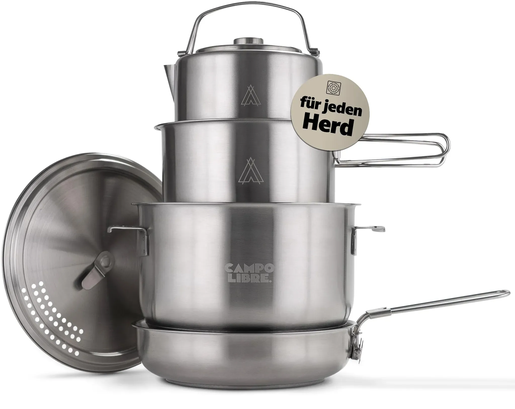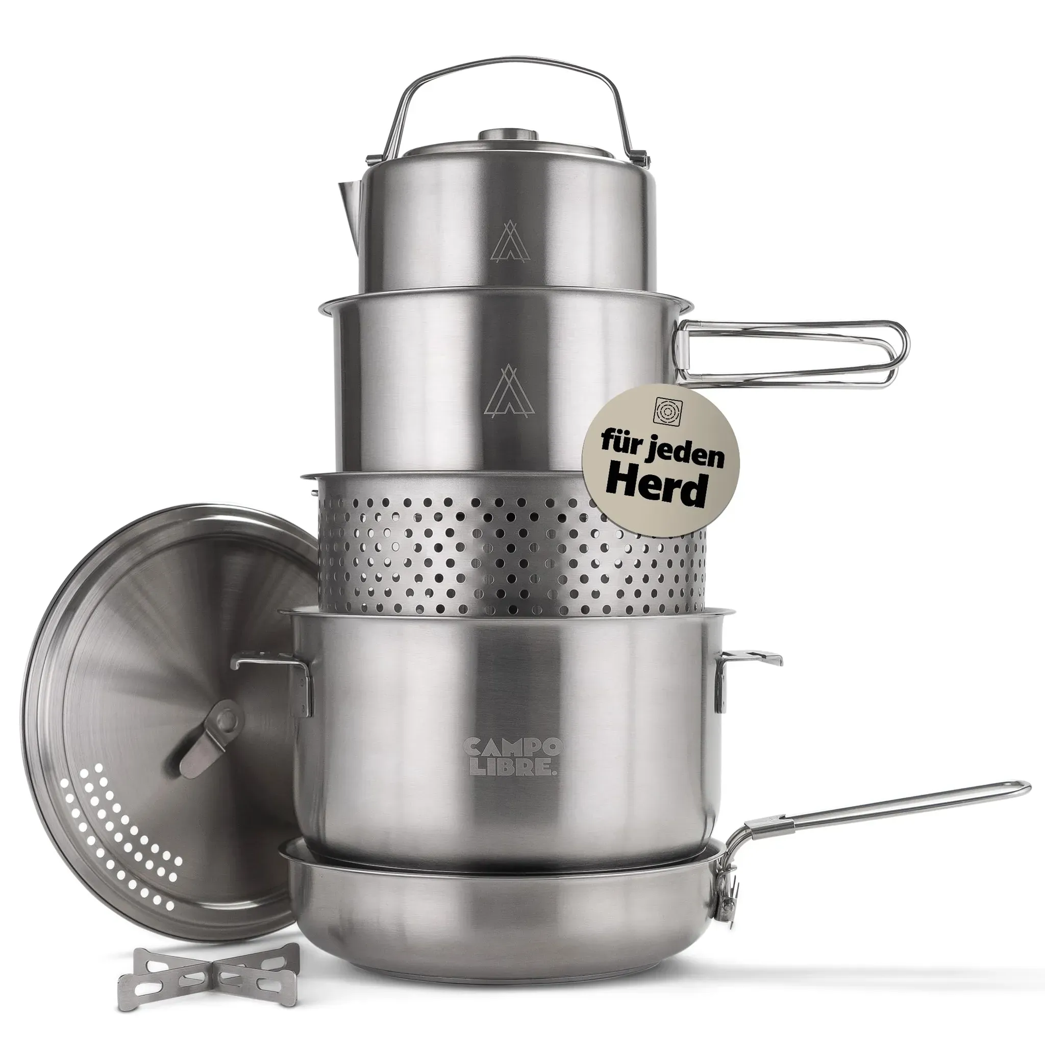 Auf Lager Versand durch AmazonCampo Libre.® Enzo I Camping Kochgeschirr aus Edelstahl I kompaktes Campinggeschirr I Outdoor Kochgeschirr induktionsgeeignet I Camping Topf, Pfanne I perfekt für den Campingkocher I 6 oder 8-teilig