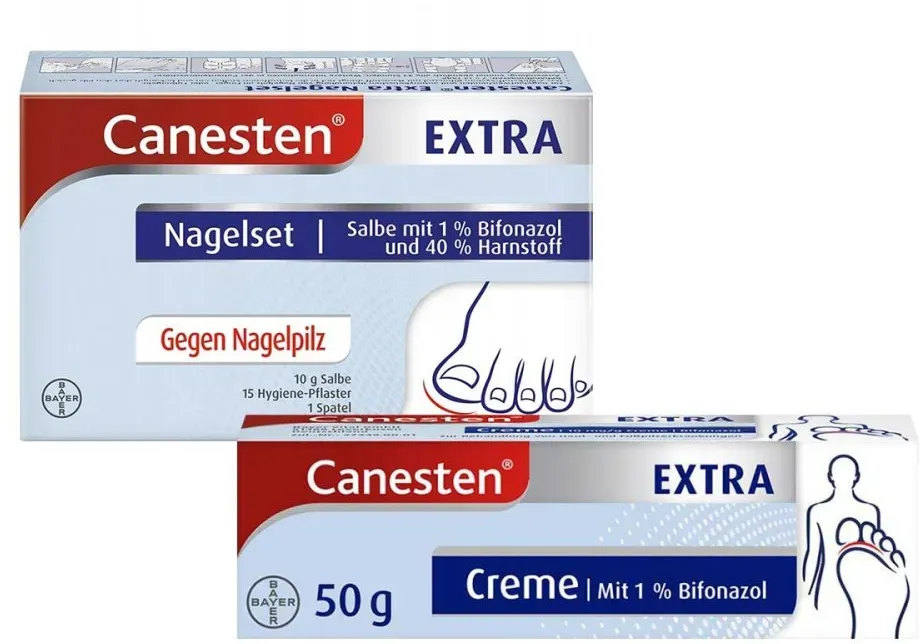 Bayer Vital - Canesten EXTRA 2-Phasen-Kurztherapie-Set bei Nagelpilz mit 50g EXTRA Creme 1 stk - bei apolux.de - aus Yadore Produktdaten Ein weiteres Set für Nagelpilz mit 50g Extra Creme, das eine komplette Kurztherapie ermöglicht. ![]() ![]() Canesten EXTRA 2-Phasen-Kurztherapie-Set bei Nagelpilz mit 50g E