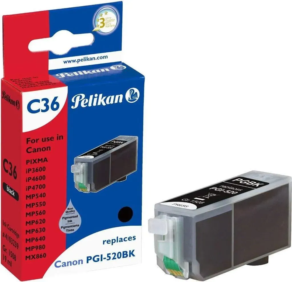 4 Händlerangebote bei billiger.de - Kategorie: Druckerpatronen - KMP - Produktbeschreibung: KMP C72 - Druckerpatrone, Verbrauchsmaterialtyp: Druckerpatrone, Drucktechnologie: Tintenstrahl, Druckfarbe: Pigmentiertes Schwarz, Kapazität: 19 ml, Enthaltene Menge: 1, Entwickelt für: Canon PIXMA iP3600, iP4600, iP4700, MP540, MP550, MP560, MP620, MP630, MP640, MP980, MP990, MX860, MX870 - GTIN:4011324150810 Dieses Angebot ist empfehlenswert, da es die günstigste kompatible Einzelpatrone ist und somit eine sehr preiswerte Alternative zum Original darstellt. ![]() ![]() Pelikan wiederbefüllte Tinte 4103239 ersetzt Canon PGI-520BK schwarz