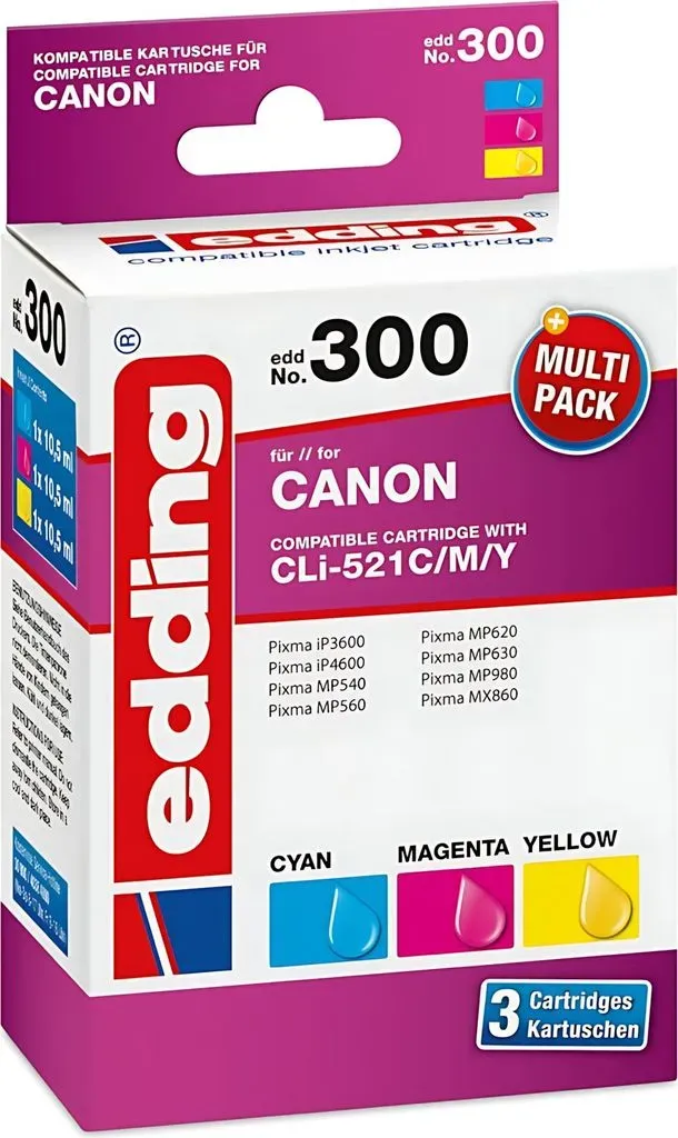 Kategorie: Druckerpatronen - KAMO - Kompatible Drucker mit: für PGI-520 CLI-521/520 521, für PIXMA MP540, MP540x, MP550, MP560, MP620, MP620B, MP630, MP640, MX860, MX870, MP980, MP990, iP3600, iP4600, iP4600x, iP4700 Drucker. Smart-Chip-Technologie für sofortige Erkennung und Echtzeit-Tintenstandüberwachung auf Ihrem Druckerdisplay. Funktioniert perfekt auf Druckerpapier, Fotopapier, glänzendem Papier, mattem Papier, Etikettenpapier und Karton/Schwergewichtspapier. Druckqualität rt: Bis zu 98% Schmierfestigkeit, Tinte trocknet schnell, selbst bei komplexen Zeichen ( , ü, ) oder feinen Schriftarten. Liefert lebendige, realistische Farben für Dokumente und Fotodrucke. Die fortschrittliche verstopfungsfreie Formel sorgt für eine lange Lebensdauer der Düsen. Hohe Seitenreichweite, Mehr Ausdrucke: Schwarz: 500+ Seiten, Farbe (PGBK/C/M/Y): 300+ Seiten. (Getestet nach ISO/IEC 24711-Standards, 5 % Deckung) Wertpaket: 1x Schwarz + 1x PGBK/Cyan/Magenta/Gelb (PGI-520 CLI-521), Installations- und anleitung. - 10,99 Euro bei Amazon Marketplace CE - gefunden von billiger.de Dieses edding kompatible Multipack ist eine bekannte und vertrauenswürdige Alternative zu Originalpatronen. ![]() ![]() edding kompatibel zu Canon CLI-521 CMY