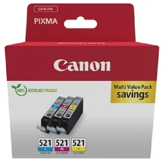 Patrone Canon 2934 B 010 Inkjet-Kartuschen - EAN:4250884113624 - Multipack kompatibel zu Canon 2934B010 / CLI-521 enthält 1x 2934 B 001 / 521 C Tintenpatrone, cyan, 530 Seiten /5% (1x8 ml), 1x 2935 B 001 / 521 M Tintenpatrone, magenta, 530 Seiten /5% (1x8 ml), 1x 2936 B 001 / 521 Y Tintenpatrone, gelb, 530 Seiten /5% ( - gefunden von Kelkoo Dieses 3-farbige Multipack ist ein Originalprodukt zu einem attraktiven Preis, das alle Grundfarben abdeckt. Printabout .de Canon CLI-521C/M/Y - 3-farbig - Druckerpatrone - Multipack