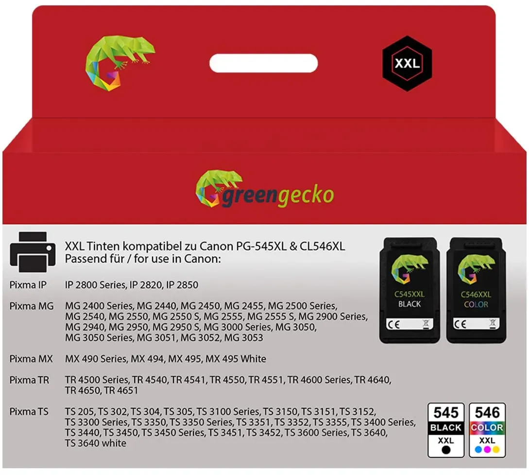 Kategorie: Druckerpatronen - green gecko - Seitenleistung: ca. 500 Seiten (schwarz), ca. 400 Seiten (color) (bei 5 % Deckung) Passend für: Pixma E 3640, Pixma IP 2800 Series, Pixma IP 2820, Pixma IP 2850, Pixma MG 2400 Series, Pixma MG 2440, Pixma MG 2450, Pixma MG 2455, Pixma MG 2500 Series, Pixma MG 2540, Pixma MG 2550, Pixma MG 2550 s, Pixma MG 2550 Series, Pixma MG 2551 S, Pixma MG 2555, Pixma MG 2555 S, Pixma MG 2556 S, Pixma MG 2900 Series, Pixma MG 2940 Passend für: Pixma MG 2950, Pixma MG 2950 S, Pixma MG 3000 Series, Pixma MG 3050, Pixma MG 3050 Series, Pixma MG 3051, Pixma MG 3052, Pixma MG 3053, Pixma MX 490 Series, Pixma MX 494, Pixma MX 495, Pixma MX 495 white, Pixma TR 4500 Series, Pixma TR 4540, Pixma TR 4541, Pixma TR 4550, Pixma TR 4551, Pixma TR 4600 Series, Pixma TR 4640, Pixma TR 4645, Pixma TR 4650, Pixma TR 4651 Passend für: Pixma TS 202, Pixma TS 205, Pixma TS 302, Pixma TS 304, Pixma TS 305, Pixma TS 3100 Series, Pixma TS 3150, Pixma TS 3151, Pixma TS 3152, Pixma TS 3300 Series, Pixma TS 3350, Pixma TS 3350 Series, Pixma TS 3351, Pixma TS 3352, Pixma TS 3355, Pixma TS 3400 Series, Pixma TS 3440, Pixma TS 3450, Pixma TS 3450 Series, Pixma TS 3451, Pixma TS 3452, Pixma TS 3600 Series, Pixma TS 3640, Pixma TS 3640 white Einfach einsetzen und wie gewohnt losdrucken. Der Toner ist zu 100 % kompatibel zu den aufgeführten Geräten, die Qualität der green gecko Tonerkartuschen wird permanent in Deutschland getestet. OEM-Kompatibilitätsbezeichnungen: PG 545 ... ![]() ![]() DRUCKER PATRONEN - für Canon eBay PG545XL CL546XL Pixma MG 2450 2550 TS3150 3350 3450