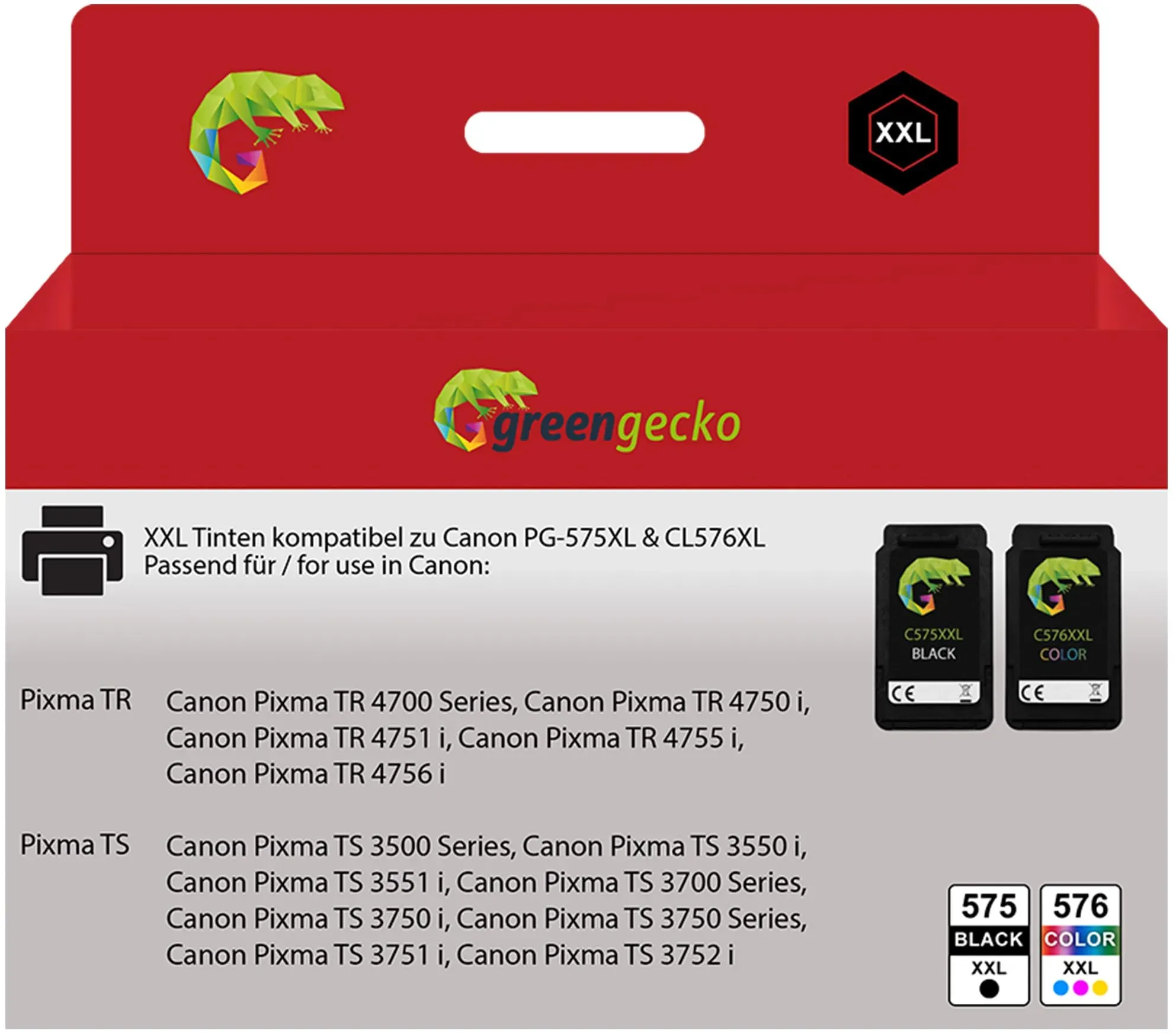 Kategorie: Druckerpatronen - green gecko - Seitenleistung: schwarz: 420 Seiten & color 340 Seiten (bei ca. 5 % Deckung), neuester Chip, mit Füllstandsanzeige Passend für: Canon Pixma TR4750i, Canon Pixma TR4751i, Canon Pixma TR4755i, Canon Pixma TR4756i, Canon Pixma TS3500 Series, Canon Pixma TS3550i, Canon Pixma TS3551i, Canon Pixma TS 3700 Series, Canon Pixma TS 3750 i, Canon Pixma TS 3750 Series, Canon Pixma TS 3751 i, Canon Pixma TS 3752 i Einfach einsetzen und wie gewohnt losdrucken. Die Tinte ist zu 100 % kompatibel zu den aufgeführten Geräte Die Qualität der green gecko Druckerpatronen wird permanent in Deutschland getestet OEM-Kompatibilitätsbezeichnungen: PG575, PG-575, PG 575 XL, CL576, CL-576, CL-576XL, 5437C001, 5441C001 - 39,99 Euro bei Amazon Marketplace CE - gefunden von billiger.de ![]() ![]() Canon PIXMA TS3750i: Drahtloser Farbtintenstrahldrucker, A4, drucken, kopieren, scannen. Kompatibel mit PIXMA Print Plan, randloses Fotodrucken, ideal für Home-Office und Smartphones