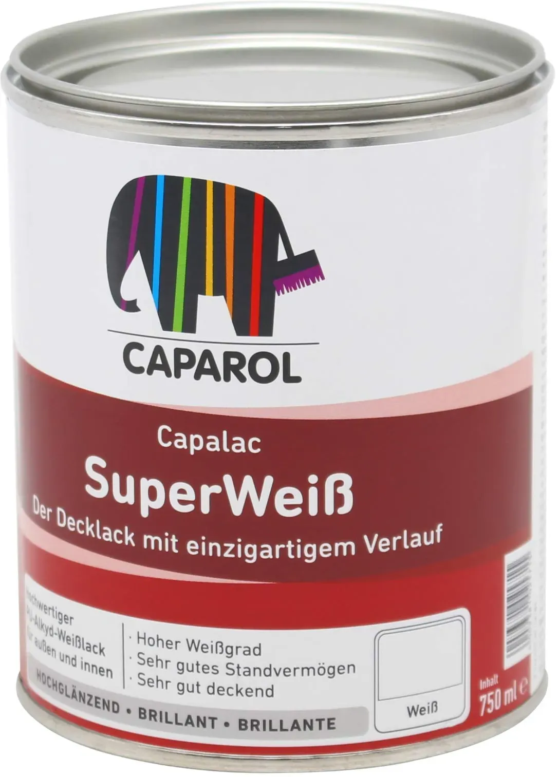 EAN: 4002381026385 - Caparol Capalac Kunstharz-Klarlack - Für Lackierungen auf unbehandelten und lasierten Holzoberflächen sowie geeigneten Lackoberflächen. ' Verwendungszweck Caparol Capalac Kunstharz-Klarlack Im Innenbereich: Für Lackierungen auf unbehandelten und lasierten Holzoberflächen sowie geeigneten Lackoberflächen wie z. B. Capalac Dickschichtlack Glimmer zur Verbesserung der mechanischen Oberflächenbelastbarkeit, Reinigungsfähigkeit und Wetterbeständigkeit. Caparol Capalac Kunstharz-Klarlack als transparente Lackierung für Eisen, Stahl, Aluminium (kein Eloxal) und Kupfer ebenfalls geeignet (Achtung: Kein Korrosions- und Oxidationsschutz!). Aufgrund der materialtypischen Geruchs entwicklung von Alkydharzlacken empfehlen wir für großflächige Beschichtungen im Innenbereich Capadur Parkett- und SiegelLack. Im Außenbereich: Für zusätzliche trans pa rente Lackierungen auf lasierten oder farbig lackierten, maßhaltigen Holzoberflächen. Eigenschaften Caparol Capalac Kunstharz-Klarlack Stoß- und schlagfest Hohe Wetterbeständigkeit Guter Verlauf Aromatenfreie Lösemittel Sehr gute Verarbeitbarkeit Vielseitig einsetzbar Beständig gegen haushaltsübliche Reinigungsmittel und kurzzeitig gegen schwache Säuren und Laugen Materialbasis Alkydharz mit aromatenfreien Lösemitteln Verpackung/Gebindegrößen 375 ml, 750 ml, 2,5 Ltr. Farbtöne Transparent Durch die leicht gelbliche Tönung des Alkyd harzes entsteht bei Lackierungen auf weißen und farbigen Oberflächen eine gering fügige ... Ein hochwertiger Bautenlack für Decklackierungen in 0,75 Liter, der für eine langlebige und strahlend weiße Oberfläche sorgt. ![]() ![]() Caparol, Capalac Superweiß AF, Bautenlack für Decklackierungen, 0,75 L, weiß