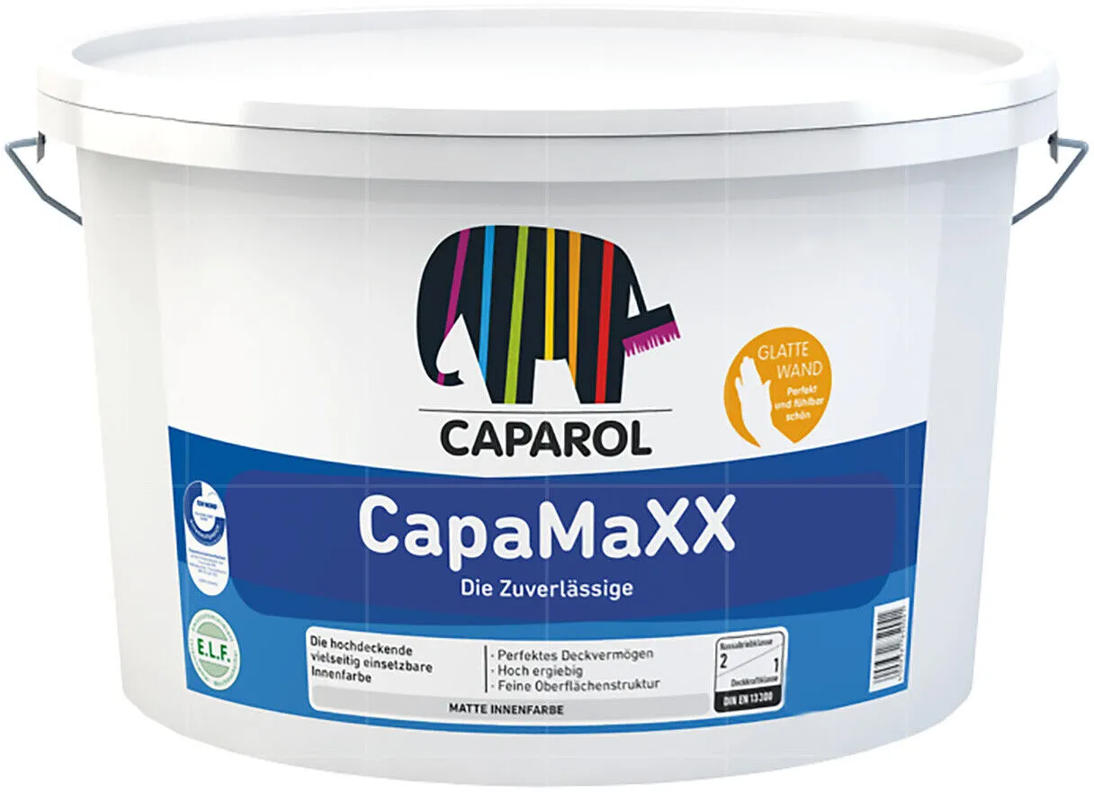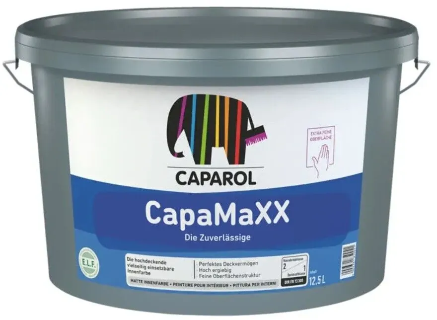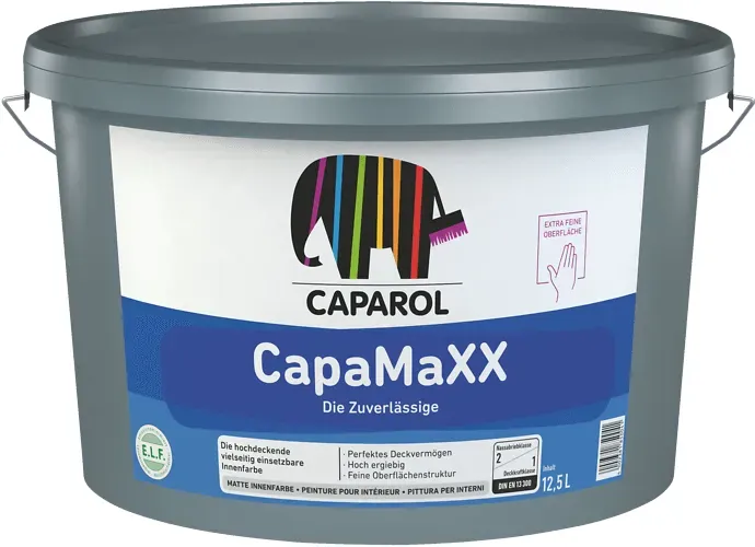 CapaMaXX ist bekannt für ihre hochdeckende Wirkung und hohe Ergiebigkeit - das bedeutet weniger Farbe für große Flächen und weniger Anstriche. ? Besonders beliebt bei Profis und bei großen Renovierungen. Die Farbe ist stumpfmatt und lässt sich leicht verarbeiten. Sie eignet sich für Wand- und Deckenanstriche und ist besonders für glatte, strukturarme Oberflächen geeignet. ? Für anspruchsvolle Ergebnisse empfiehlt sich die Kombination mit speziellen Rollern und Vliesen. ? Sehr beliebt in sensiblen Bereichen wie Kinderzimmern, Büros oder Allergikerhaushalten. ? Ideal für Wohn- und Arbeitsbereiche mit mittlerer Beanspruchung. CapaMaXX ist in vielen Farbtönen erhältlich und kann maschinell abgetönt werden (z.?B. über ColorExpress). ? Flexibel für individuelle Farbwünsche. Typische Gebinde: 2,5?l, 5?l, 12,5?l, 15?l ? Für kleine und große Projekte geeignet. ? Beliebtheit & Markenreputation