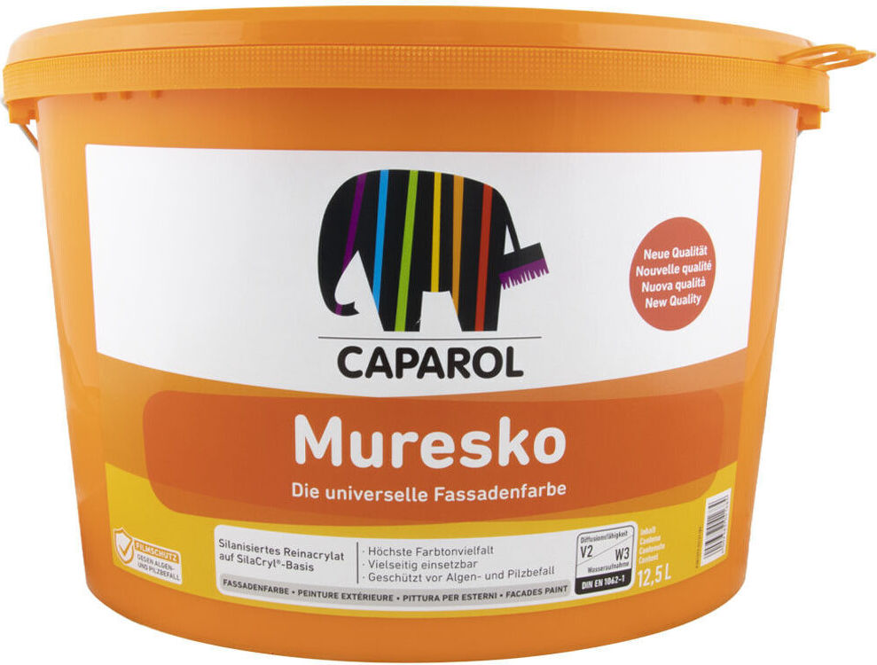 EAN: 4034139155818 - Silanisierte Reinacrylat-Fassadenfarbe auf SilaCryl-Basis, diffusionsfähig und gleichzeitig sehr gut wasserabweisend mit breitem Farbspektrum. Achtung! H317 - Kann allergische Hautreaktionen verursachen. ' Caparol Muresko Fassadenfarbe Caparol Muresko Fassadenfarbe Fassadenfarbe für die verschiedenste Untergründe. Einsetzbar auf allen intakten Wärmedämm-Verbundsystemen, tragfähigen Dispersionsfarbenanstrichen, organisch gebundenen Putzen, mineralischen Untergründen, Beton, Faserzement, Ziegel-Sichtmauerwerk, Porenbeton, zementgebundene Holzspanplatten uvm. Je nach Verdünnung ermöglicht Muresko strukturerhaltende oder strukturausgleichende Beschichtungen. Speziell auch zur Renovierung von tragfähigen Porenbeton-Altbeschichtungen und auf Porenbeton-Montagebauteilen geeignet. Eigenschaften Innovatives, neuartiges SilaCryl -Bindemittel Höchste Farbtonvielfalt Vielseitig einsetzbar Geschützt vor Algen- und Pilzbefall Sehr gute Haftung auf den meisten Fassadenoberflächen Alkaliresistent, daher unverseifbar Materialbasis Silanisiertes Reinacrylat auf SilaCryl -Bindemittelbasis mit Siliconvergütung Verpackung/Gebindegrößen Standardware: 2,5 l, 5 l, 12,5 l ColorExpress:1,25 l, 2,5 l, 5 l, 7,5 l, 12,5 l Farbtöne Weiß. Weitere Farbtöne sind über ColorExpress tönbar. Werkseitig abgetönt lieferbar bei Bezug von 100 Litern und mehr in einem Farbton und Auftrag. Um evtl. Abtönfehler zu erkennen, bitte vor Verarbeitung auf Farbtonexaktheit überprüfen. Bei ... Dieses Angebot von Farbklecks24 im amazon.de Marketplace für 134.06 Euro für 12,5 Liter ist eine preiswerte Option. ![]() ![]()