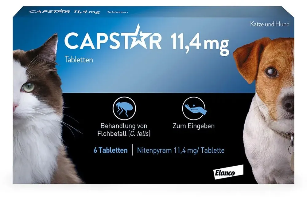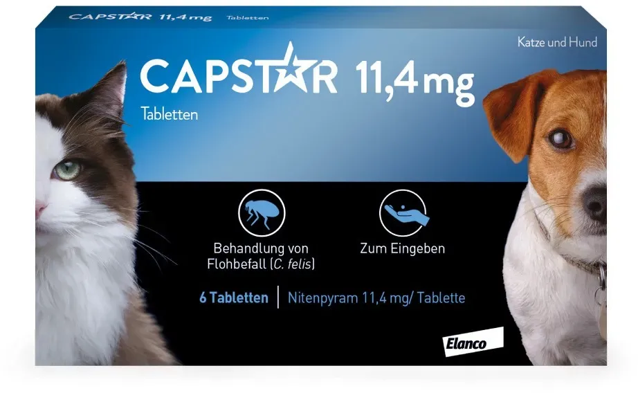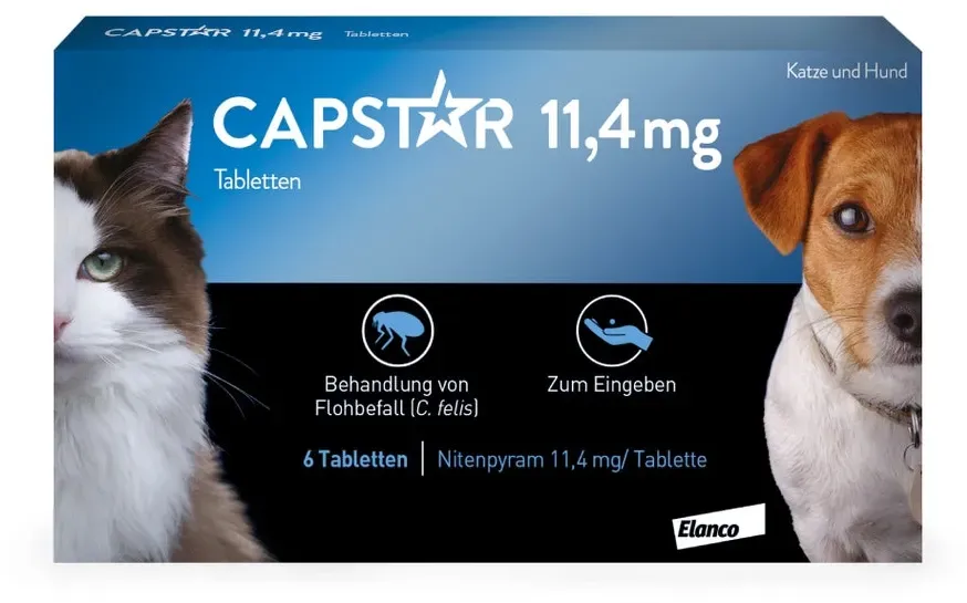 3,04 /Stück - Kategorie: Tiergesundheit - Elanco - GTIN:4150012763595 - PZN:01276359 - Capstar 11.4 mg Tabletten zur oralen Eingabe Wirkstoff pro Tablette: Nitenpyram 11,4 mg Tierarzneimittel für die Bahandlung von Flohbefall bei Katzen und Hunden, welches Ihr Liebling innerhalb von 24 Stunden von den Parasiten befreit. Einfache Anwendung ohne unangenehmen Geruch oder Unordnung in Ihrer Wohnung. Geeignet für Katzen und kleine Hunde von 1 kg bis 11 kg. - 18,23 Euro bei medikamente-per-klick.de - gefunden von billiger.de Ein weiteres sehr preiswertes Angebot für Capstar 11,4 mg für Katzen und kleine Hunde von einem bekannten Anbieter. ![]() ![]() Elanco CAPSTAR 11,4 mg Tabletten f.Katzen/kleine Hunde 6 St