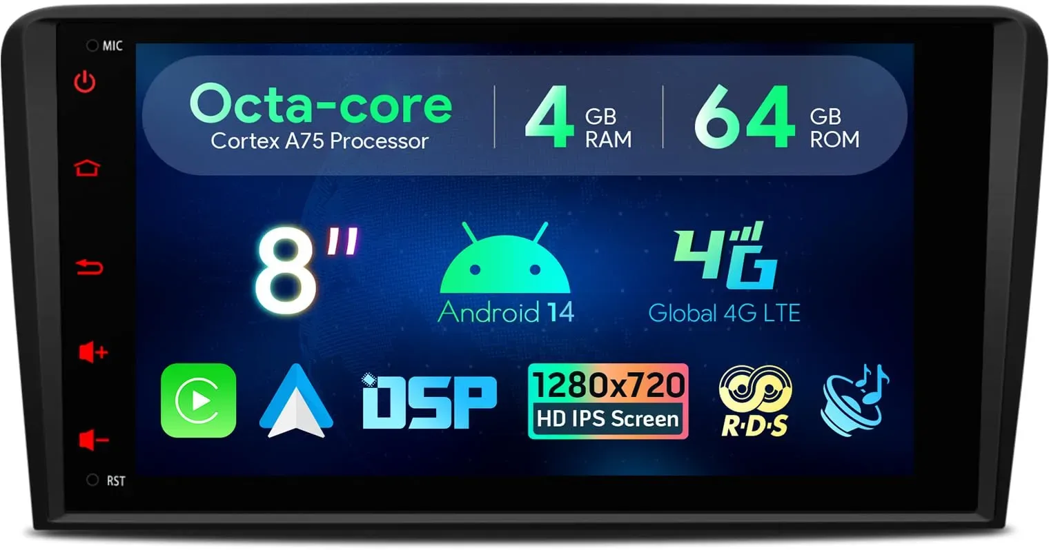 Kategorie: Car-Multimedia-Systeme - ERISIN - Android 14.0 | 8-Kern | 4GB RAM+64GB ROM 7 zoll universal autoradio cd player mit Hochleistungskonfiguration, ausgestattet mit 8-Kern 2 * A75 + 6 * A55 64-Bit 1800 MHz Prozessor. Betriebssystem: Android 14.0, booten Sie schneller und führen Sie verschiedene Anwendungen einfacher aus. RAM: 4GB, ROM: 64GB. Unterstützt 3 USB bis zu 5*256GB erweiterter Speicher. Kapazitiver HD Touchscreen mit einer Auflösung von 1024 * 600. Audioausgang: 4 * 48W. Integrierte CD, DVD, USB, TF, Radio, RDS, Uhr, Kalender, Rechner. GPS Navigation + Bluetooth 5.0 Eingebauter GPS Empfänger, wir stellen Ihnen eine kostenlose Offline-Karte und eine GPS Antenne zur Verfügung. Sie können auch die Online-Karte/Navigation über das verbundene Internet verwenden. Zusätzlich können Sie abhängig von Ihrer täglichen Nutzung andere Karten/Navigations Apps (iGO, Waze, Sygic, HereWeGo) installieren. Mehr Auswahl, mehr Komfort! Eingebautes Bluetooth Modul, das Freisprechen, Telefonbuch-Download und Suche sowie A2DP Musik unterstützt. Wireless CarPlay & Android Auto + DSP-Verstärker Schließen Sie einfach ein iPhone (über BT) oder ein Android-Smartphone (über BT/USB) an dieses Radio an, dann können Sie ganz einfach telefonieren, Nachrichten senden und empfangen, Musik hören und vieles mehr Verwenden Sie während der Fahrt die Online-Navigation, damit Sie sich auf die Straße konzentrieren können. Eingebauter DSP-Verstärker, der den perfekten Soundeffekt in Ihr Auto bringt. ... Ein leistungsstarkes XTRONS Autoradio mit Android 13, Octa Core Prozessor, 4GB RAM und 64GB Speicher, speziell für Audi A3 Modelle. ![]() ![]() XTRONS 8 Zoll Android 13 Autoradio Octa Core 4GB 64GB Multimedia Player Eingebauter 4G LTE CarAutoPlay Android Auto DSP GPS Bluetooth 5.0 WLAN USB Optional OBD DAB DVR TPMS Für Audi A3 S3 RS3