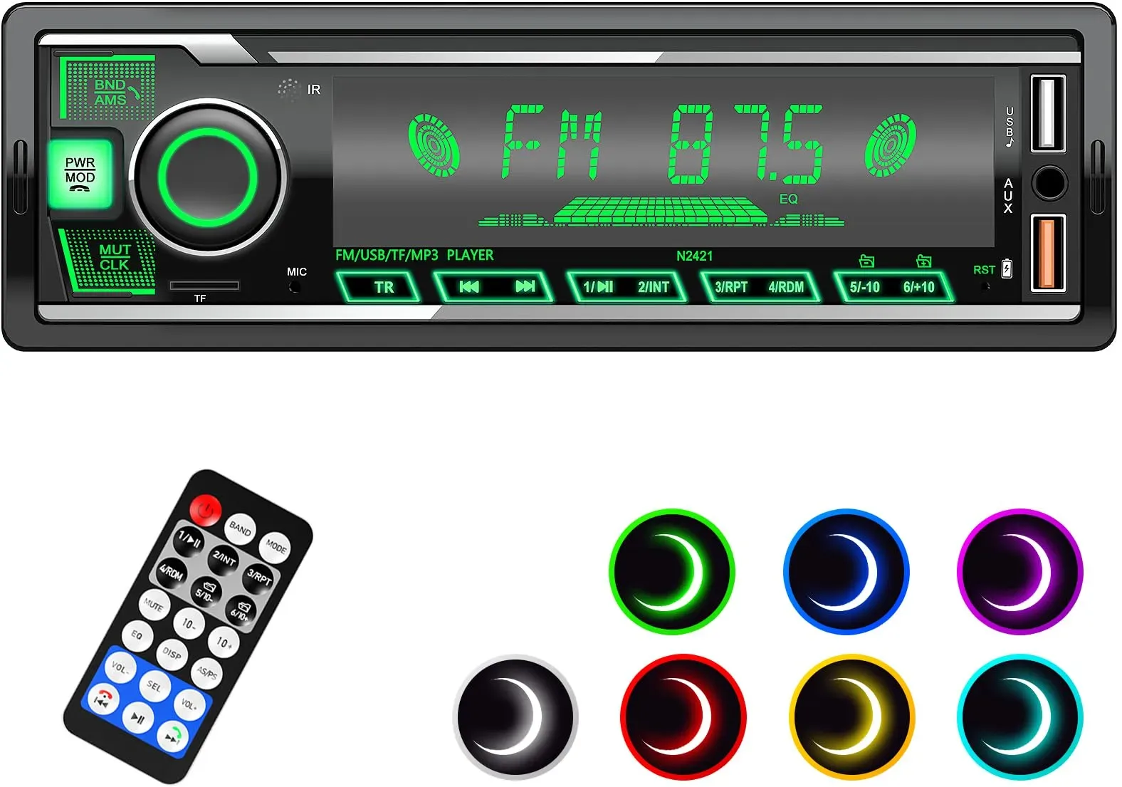 Kategorie: Zubehör für Car HiFi - Wistrue - GTIN:0711182005348 - Großer LCD-Bildschirm mit 7 Farben: Der Bildschirm ist größer als bei den meisten Autoradios auf dem Markt und die fortschrittliche Anzeigetechnologie macht die Anzeige auch bei hellem Sonnenlicht klarer. Das Autoradio hat eine Beleuchtung in 7 Farben; Sie können die Farben je nach Stimmung ändern oder automatisch ersetzen. Autoradio mit Bluetooth-Freisprecheinrichtung: Dieses Autoradio verfügt über Bluetooth 5.0 für schnellere, stabilere Verbindungen. Genießen Sie freihändige Anrufe und nahtlose Musikwiedergabe mit der integrierten Bluetooth-Funktion. FM-Autoradio mit Senderspeicherfunktion: FM-Radiobereich: 87,50 MHz ~ 108,00 MHz, 18 voreingestellte Radiosender können gespeichert werden. Genießen Sie klaren und zuverlässigen Empfang. Die intuitiven Bedienelemente und das kompakte Design des Autoradios sind auf Komfort ausgelegt und machen es zum perfekten Begleiter für Roadtrips, Pendelfahrten oder tägliche Fahrten. Einfach zu bedienen: Das Bluetooth autoradio mit 2 USB-Anschlüssen, ein USB-Anschluss für 2,1-A-Schnellladen, der andere USB-Anschluss für Musik (unterstützt MP3/WMA/WAV-Wiedergabeformat). SD-Karte und Aux-Eingang sind zur Verwendung bereit. Beeindruckende Klangqualität: Erleben Sie klaren, lebendigen Ton mit Unterstützung für MP3, WMA und WAV Formate. Sie können ganz einfach zwischen den EQ-Einstellungen Pop, Rock, Flat, Jazz oder Classic wechseln, um Ihre Musik zu verbessern und jeden Moment ... Ein Hikity MP3 Auto Player mit 180W Leistung und Ladefunktion, der eine gute Audioqualität verspricht. ![]() ![]()