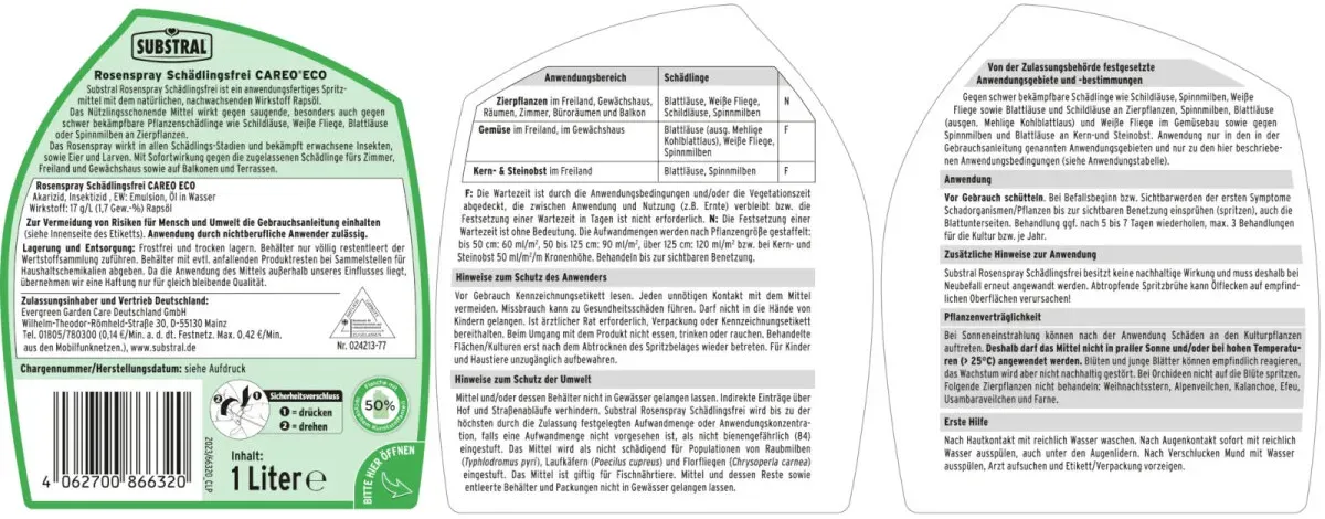 29,97 /l - Kategorie: Pflegemittel & Schädlingsbekämpfung - Substral - GTIN:4062700866504 - Substral Blattlaus Schädlingsfrei ist ein anwendungsfertiges Spritzmittel mit einem natürlich nachwachsenden Wirkstoff. Das Mittel wirkt gegen Blattläuse an Zierpflanzen, Obst & Gemüsepflanzen. Gebrauchsanleitung: Anwendung: Vor Gebrauch schütteln. Bei Befallsbeginn bzw. Sichtbarwerden der ersten Symptome/Schadorganismen Pflanzen bis zur sichtbaren Benetzung einsprühen, auch die Blattunterseiten. Behandlung ggf. nach 5 bis 7 Tagen wiederholen, max. 3 Behandlungen für die Kultur bzw. je Jahr. Bei der Anwendung den Untergrund der Pflanze großzügig abdecken, um empfindliche Oberflächen vor der abtropfenden Flüssigkeit zu schützen. Die Abdeckung erst entfernen, wenn die Spritzbrühe auf der Pflanze angetrocknet ist. Anwendungsgebiete und bestimmungen: Gegen Spinnmilben und Blattläuse an Kern- und Steinobst, Spinnmilben, Blattläuse (ausgen. Mehlige Kohlblattlaus) und Weiße Fliege im Gemüsebau sowie gegen Blattläuse, Spinnmilben, Weiße Fliege und Schildläuse an Zierpflanzen. Anwendung nur in den in der Gebrauchsanleitung genannten Anwendungsgebieten und nur zu den hier beschriebenen Anwendungsbedingungen. Die Wartezeit ist durch die Anwendungsbedingungen und/oder die Vegetationszeit abgedeckt, die zwischen Anwendung und Nutzung (z.B. Ernte) verbleibt bzw. die Festsetzung einer Wartezeit in Tagen ist nicht erforderlich. Die Festsetzung einer Wartezeit ist ohne Bedeutung. Die Aufwandmengen ... Dieses Rosenspray ist eine kostengünstige und spezifische Lösung für Rosenschädlinge. ![]() ![]() Substral Rosenspray Schädlingsfrei Careo ECO - 1 Liter
