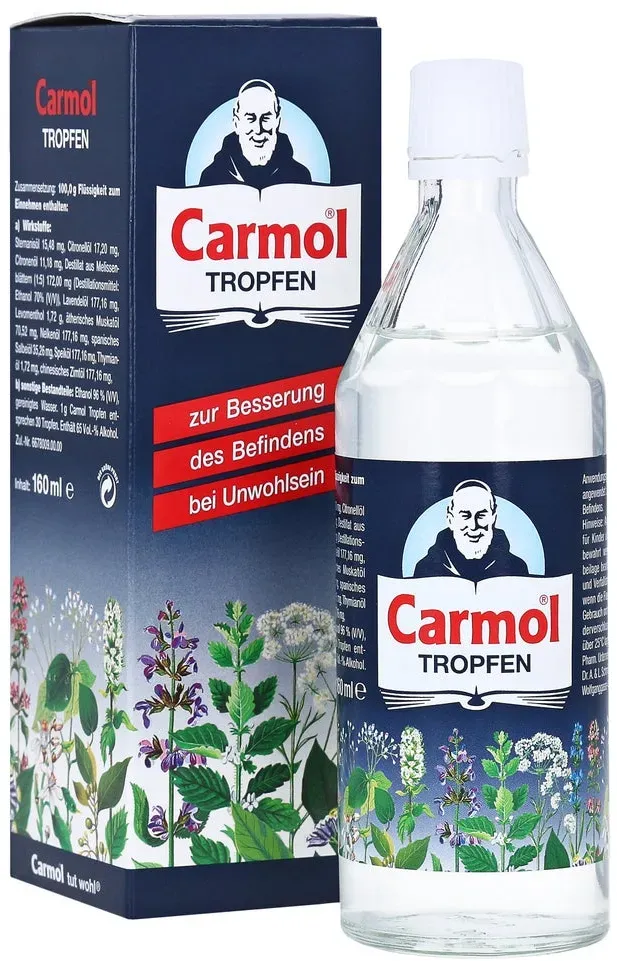 Carmol 160 META PreisvergleichMit dem Meta-Preisvergleich suchen Sie gleichzeitig bei den großen Preisvergleich Portalen!Jetzt live Suche nach carmol 160 starten! Carmol 160 KaufberatungCarmol 160 bezieht sich auf Carmol Tropfen in der 160-ml-Flasche, ein Arzneimittel mit ätherischen Ölen aus 10 Heilpflanzen wie Cassia-Zimt, Zitronengras, Lavendel, Nelken, Thymian und weiteren. Es wird traditionell zur Linderung von Magenbeschwerden (Völlegefühl, Blähungen), Nervosität, Schlafstörungen sowie zur äußerlichen Anwendung bei Muskelschmerzen und zum Gurgeln bei Erkältungen verwendet[1][3]. Wichtige Produktmerkmale: