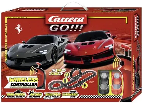 Kategorie: Carrera - Carrera - GTIN:4007486625785 - Die Faszination authentischer Ferrari-Supersportwagen Das Carrera GO!!! Set Ferrari Supercar Power bietet nicht nur ein Rennabenteuer, sondern auch die Möglichkeit, die legendären Ferrari-Fahrzeuge in Aktion zu sehen. Mit den Modellen Ferrari SF-90 XX Stradale - Grigio Scuro und Ferrari SF-90 XX Stradale - Rosso Corsa tauchen Rennfahrer ab n in die Welt der Ferrari-Supersportwagen ein. In diesem Set erleben die Fans die ikonischen Ferrari-Modelle auf einer 5,3 Meter langen, actiongeladenen Strecke. Mit Geraden, Kreuzung, Loopings und mehr, bietet dieses Set ein unvergleichliches Rennabenteuer und Nervenkitzel in den eigenen vier Wänden. Im Set sind WIRELESS-Handregler für kabellose Freiheit an der Autorennbahn enthalten. - 64,99 Euro bei voelkner - gefunden von billiger.de ![]() ![]() Carrera - 20062578 GO!!! Ferrari Supercar Power (Wireless) Rennbahn-Set I Rennbahn mit lizensierten Slotcars | bis zu 2 Spieler | Für Kinder ab 6 Jahren & Erwachsene